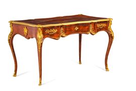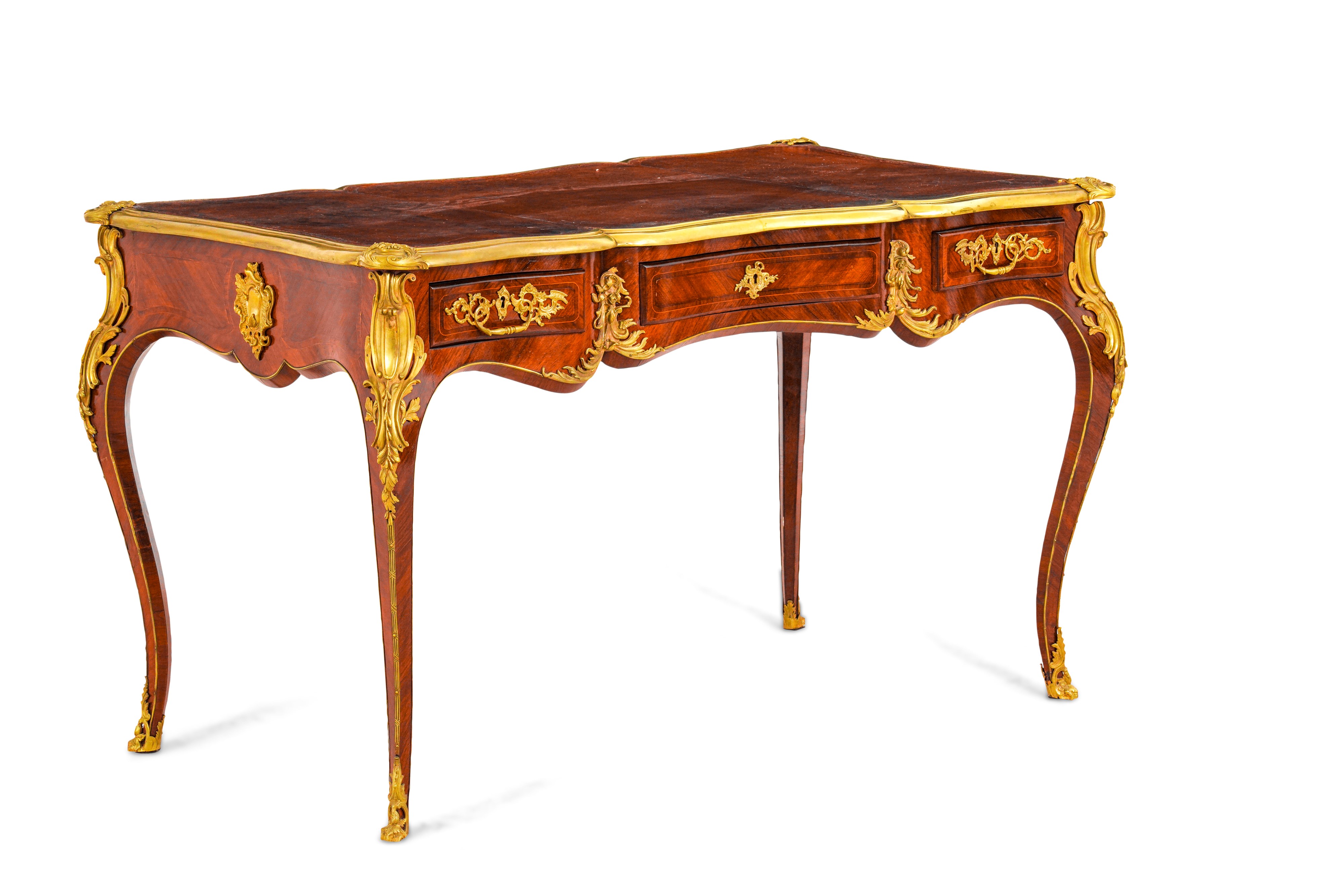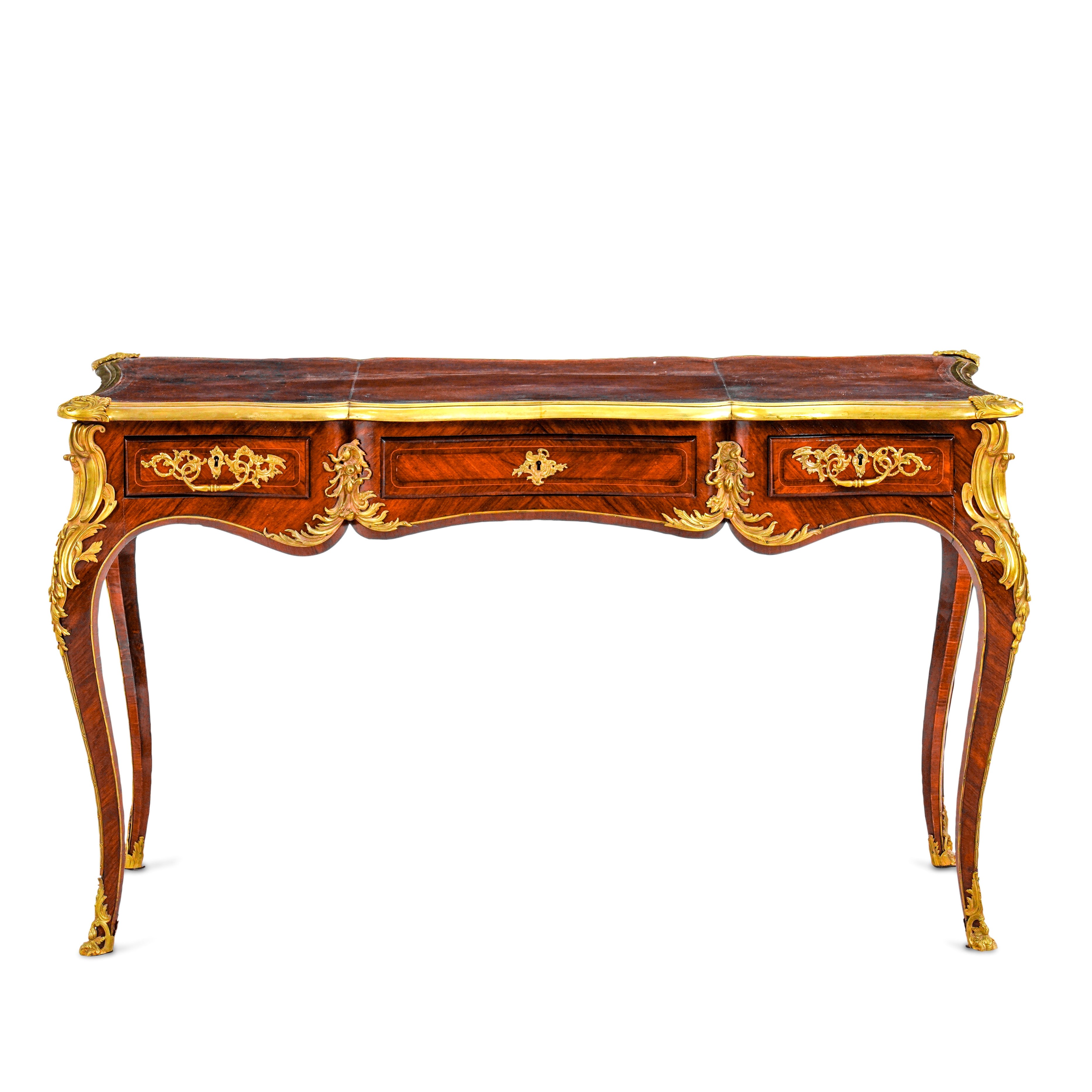 Di forma mossa, lastronata in palissandro e riccamente decorata da applicazioni rocailles in bronzo cesellato e dorato. Tre cassetti nella fascia, piano in pelle profilato in bronzo dorato