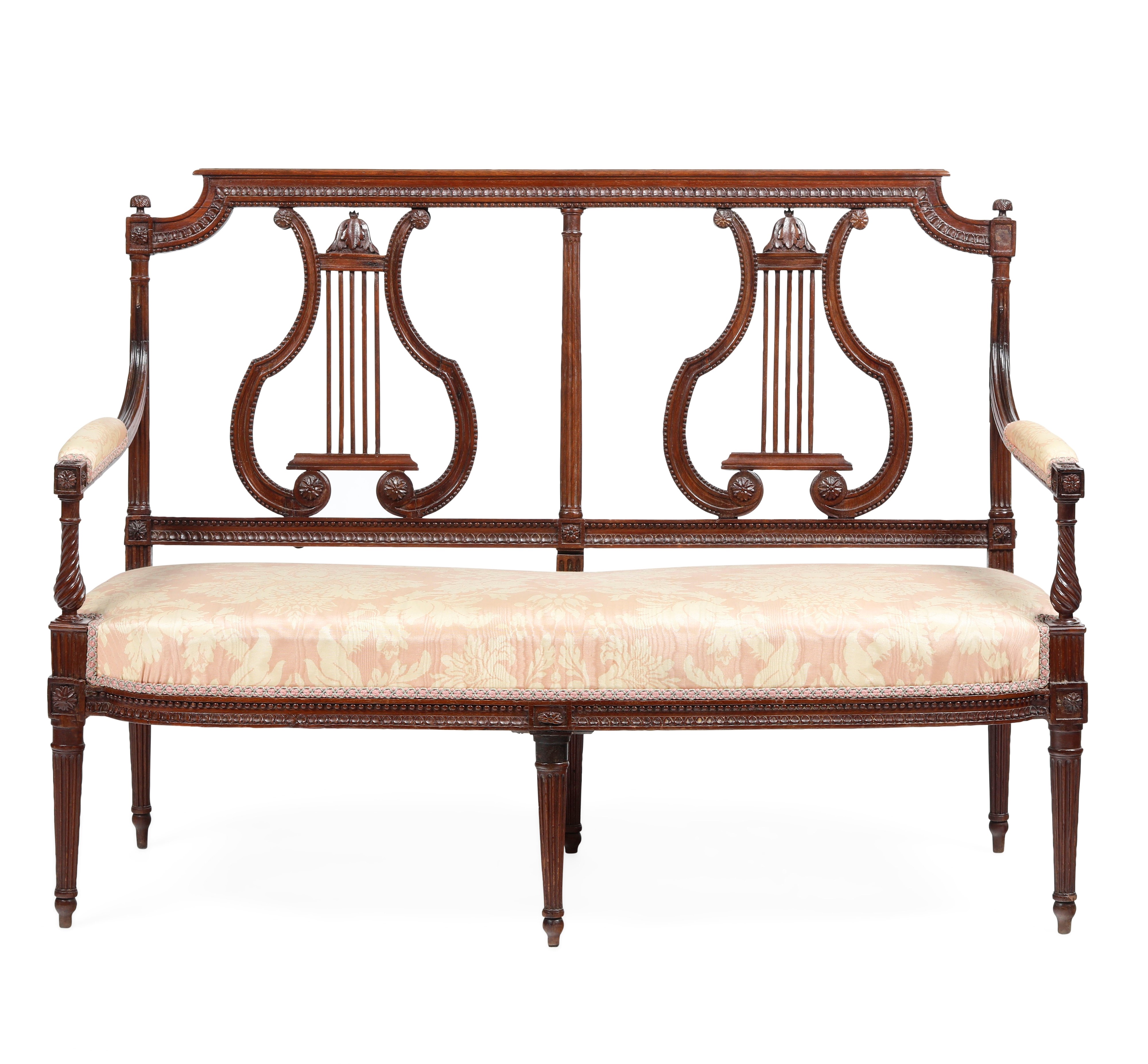 Schienale a lira, seduta imbottita, gambe troncoconiche scanalate, braccioli a torciglioni