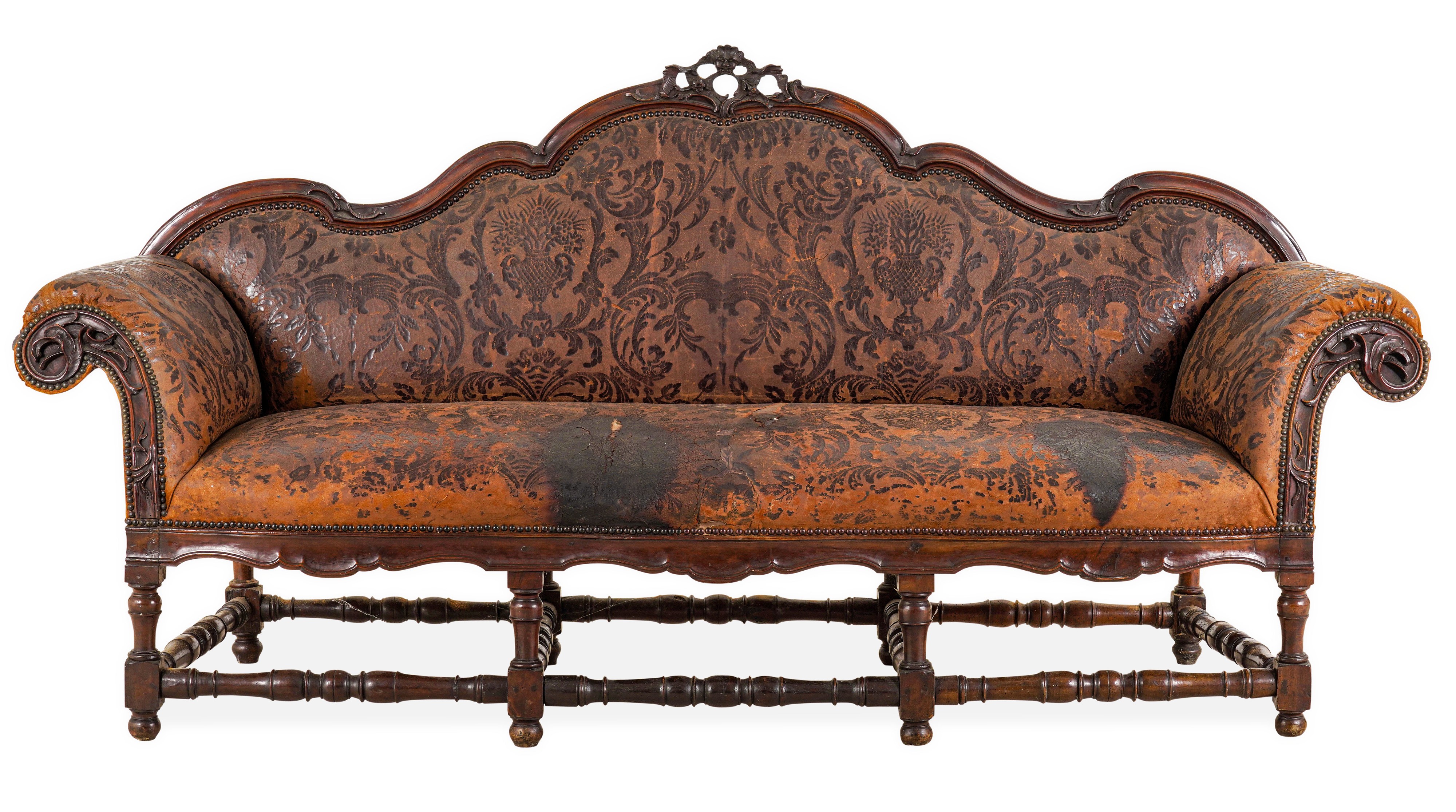 Noce intagliato e tornito, schienale sagomato con cimasa traforata, braccioli estroflessi con decori vegetali intagliati, grembiale sagomato, gambe e traverse a rocchetto, rivestito in cuoio damascato