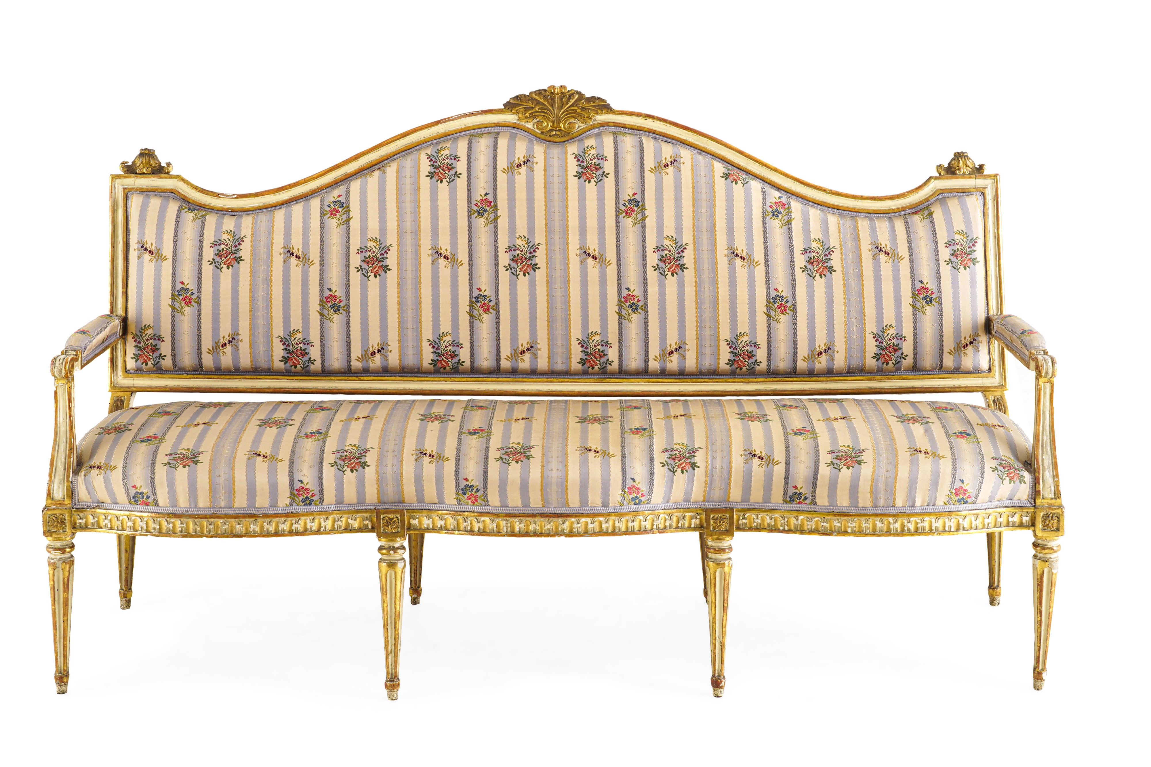 Divano Luigi XVI in legno intagliato, laccato e dorato. XVIII secolo