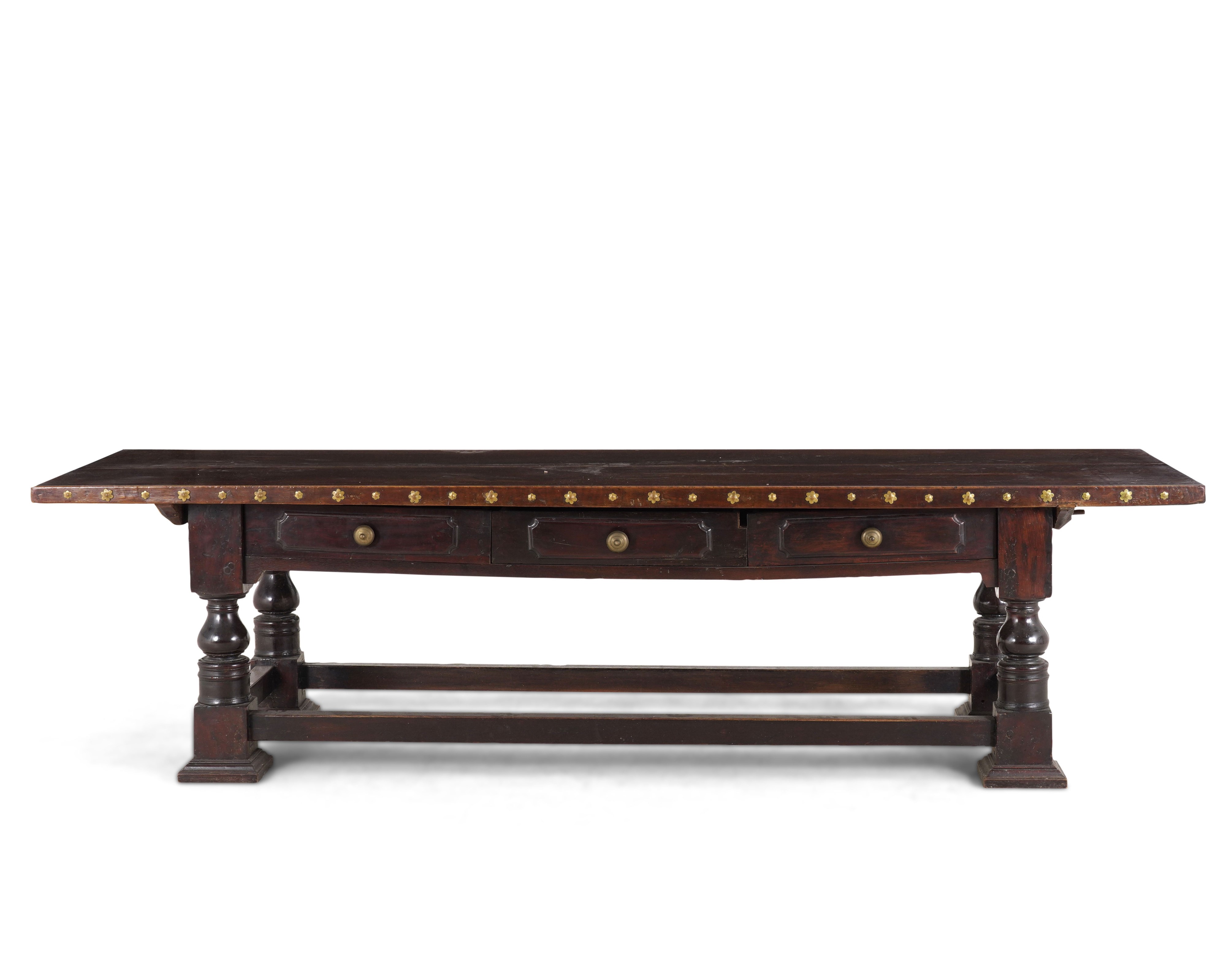 Gambe tornite riunite da traverse, tre cassetti pannellati nella fascia, bordo del piano decorato con borchie in bronzo (restauri e sostituzioni)