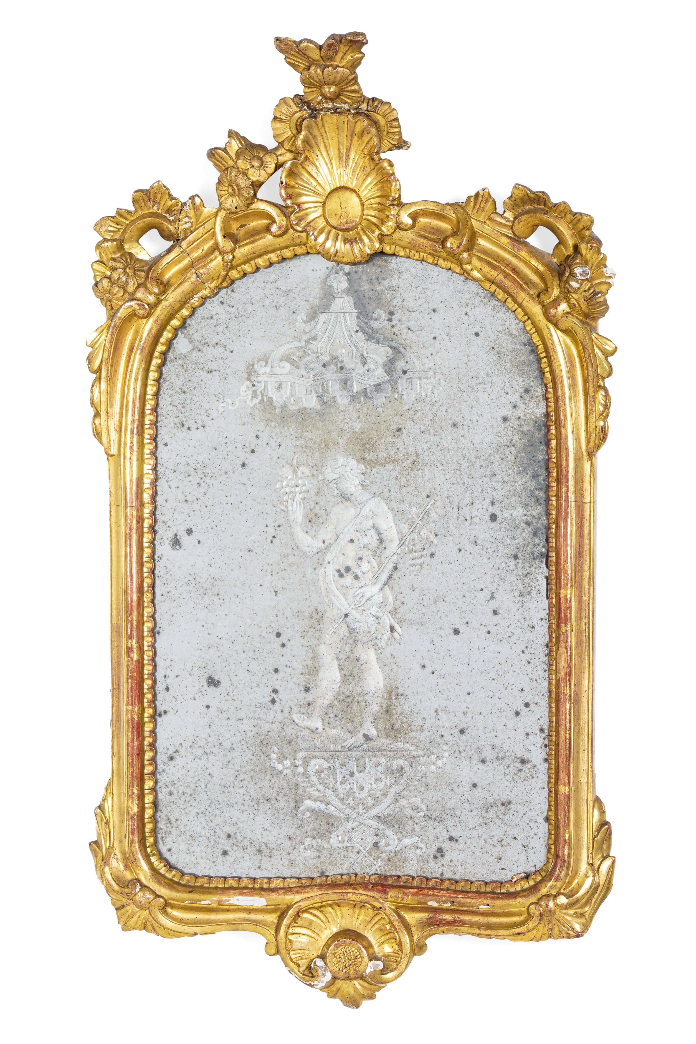 Vetro inciso con allegorie delle stagioni e cornici in legno intagliato e dorato a volute e pellacce (lievi differenze, mancanze)