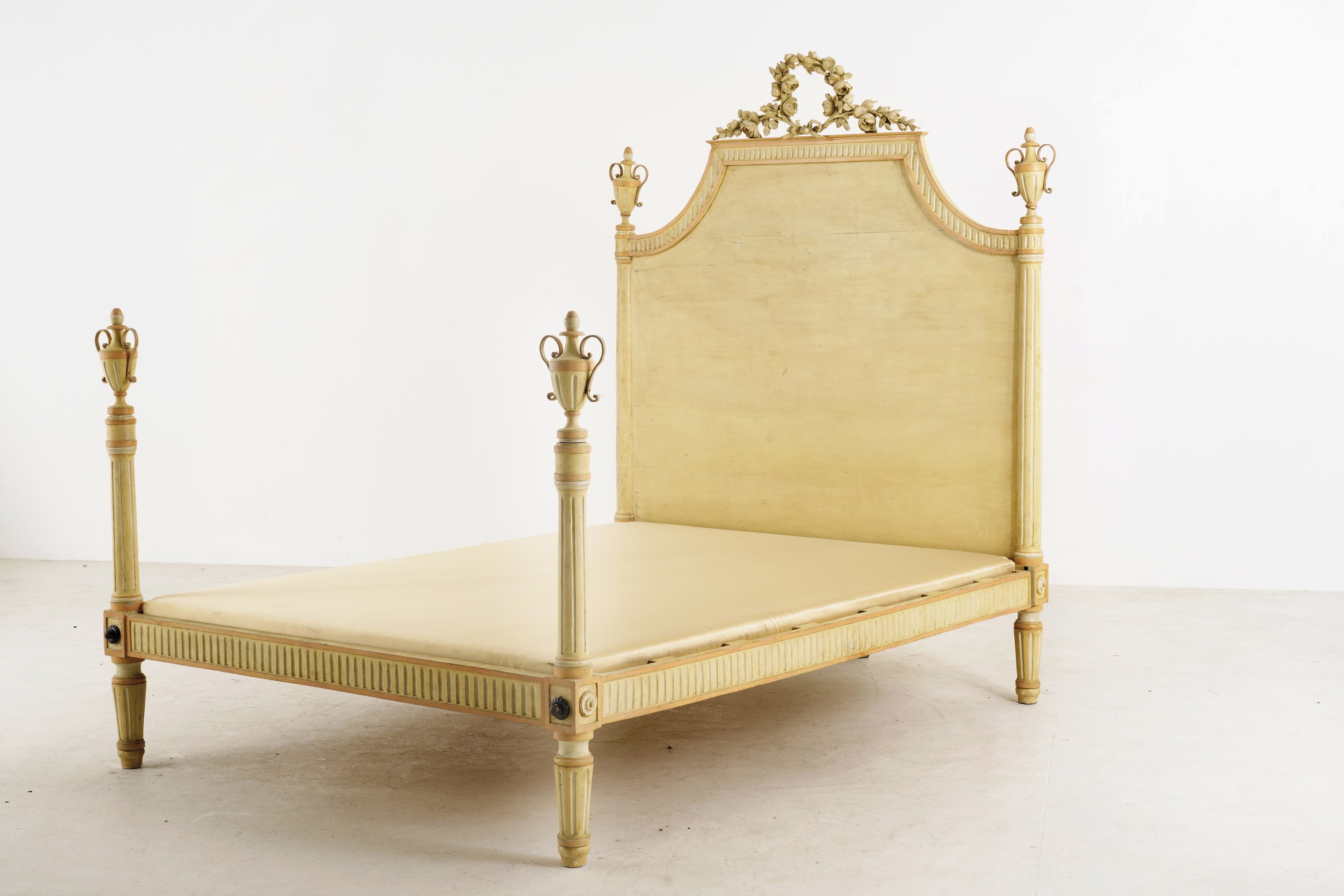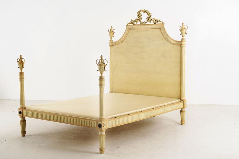 Montanti a colonna con terminale a vaso biansato, alta testiera sagomata, piedi rastremati e scanalati (lacca di epoca posteriore)