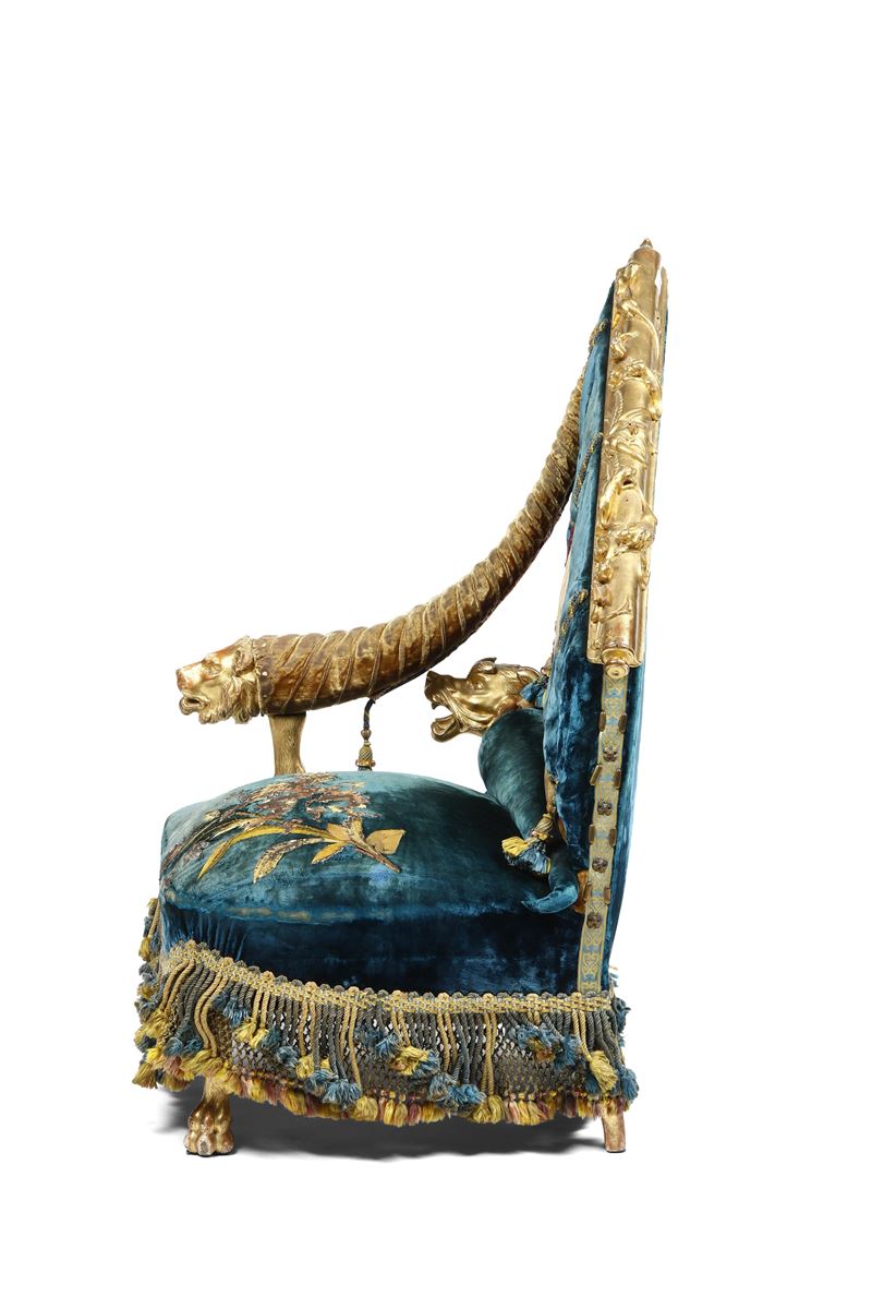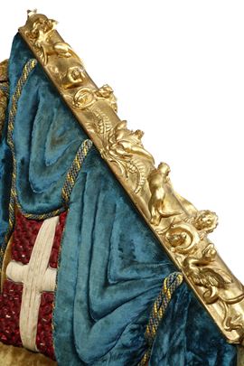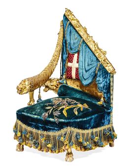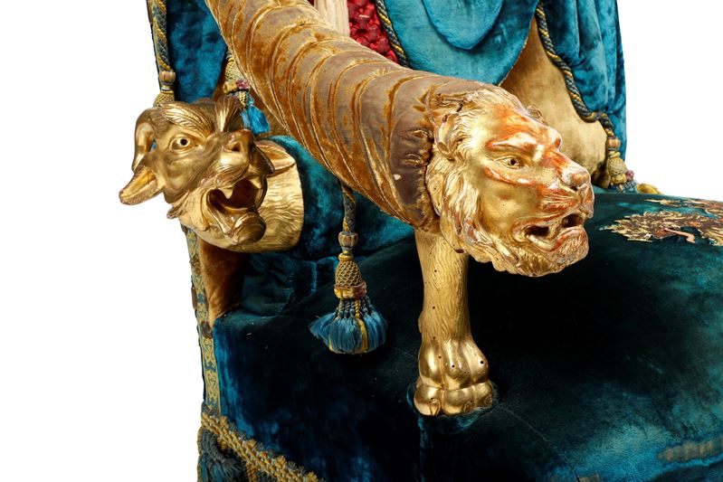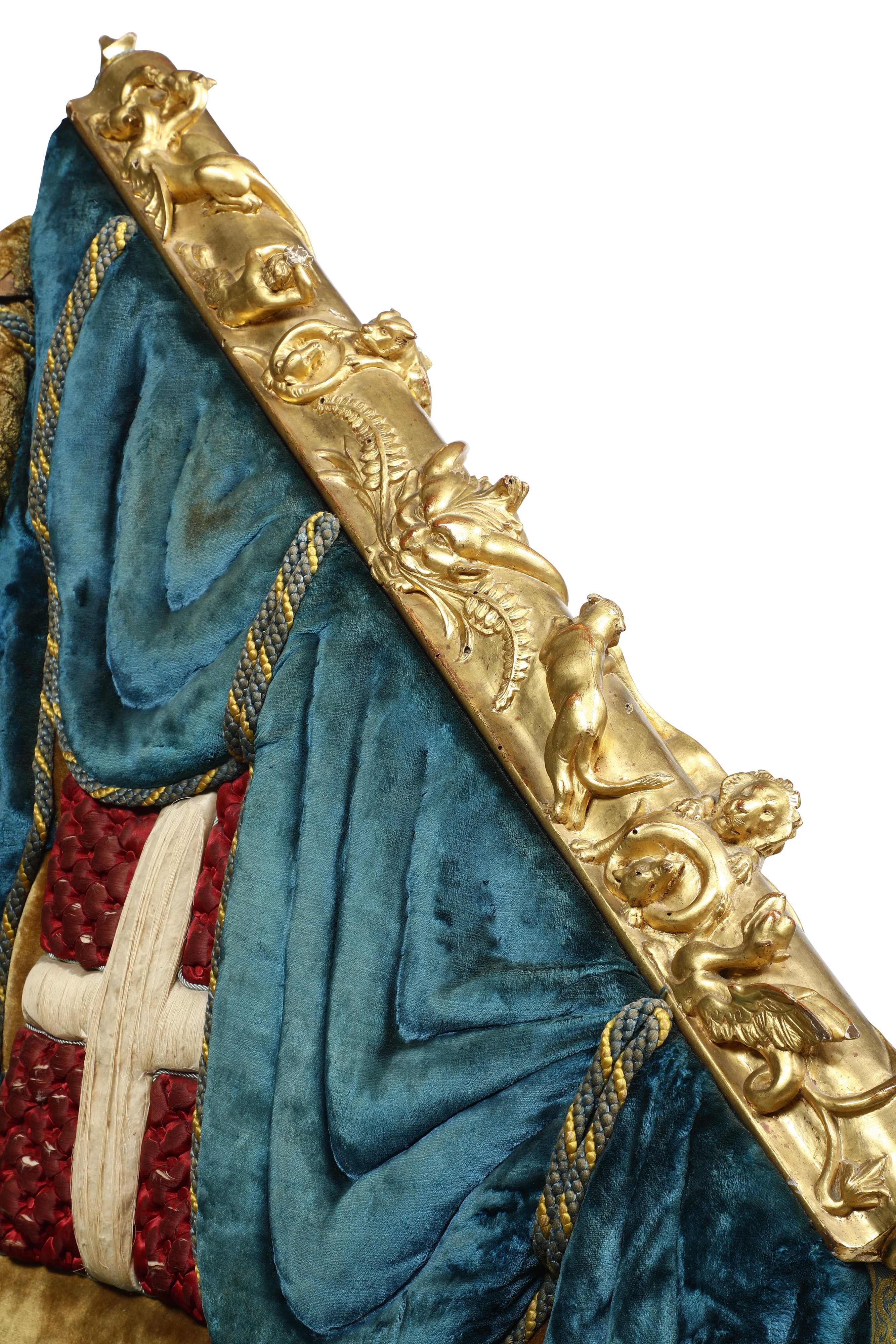 Legno scolpito e dorato, ricco rivestimento con frange recante stemma della famiglia Cesarini Sforza e stemma Sabaudo. Lo schienale, in legno dorato decorato ad animali fantastici, simula un'asta dalla quale si srotola uno stendardo a formare lo schienale e la seduta; un bracciolo terminante a testa di leone in legno scolpito e dorato, l'altro trasversale con animale fantastico, piedini anteriori zoomorfi.