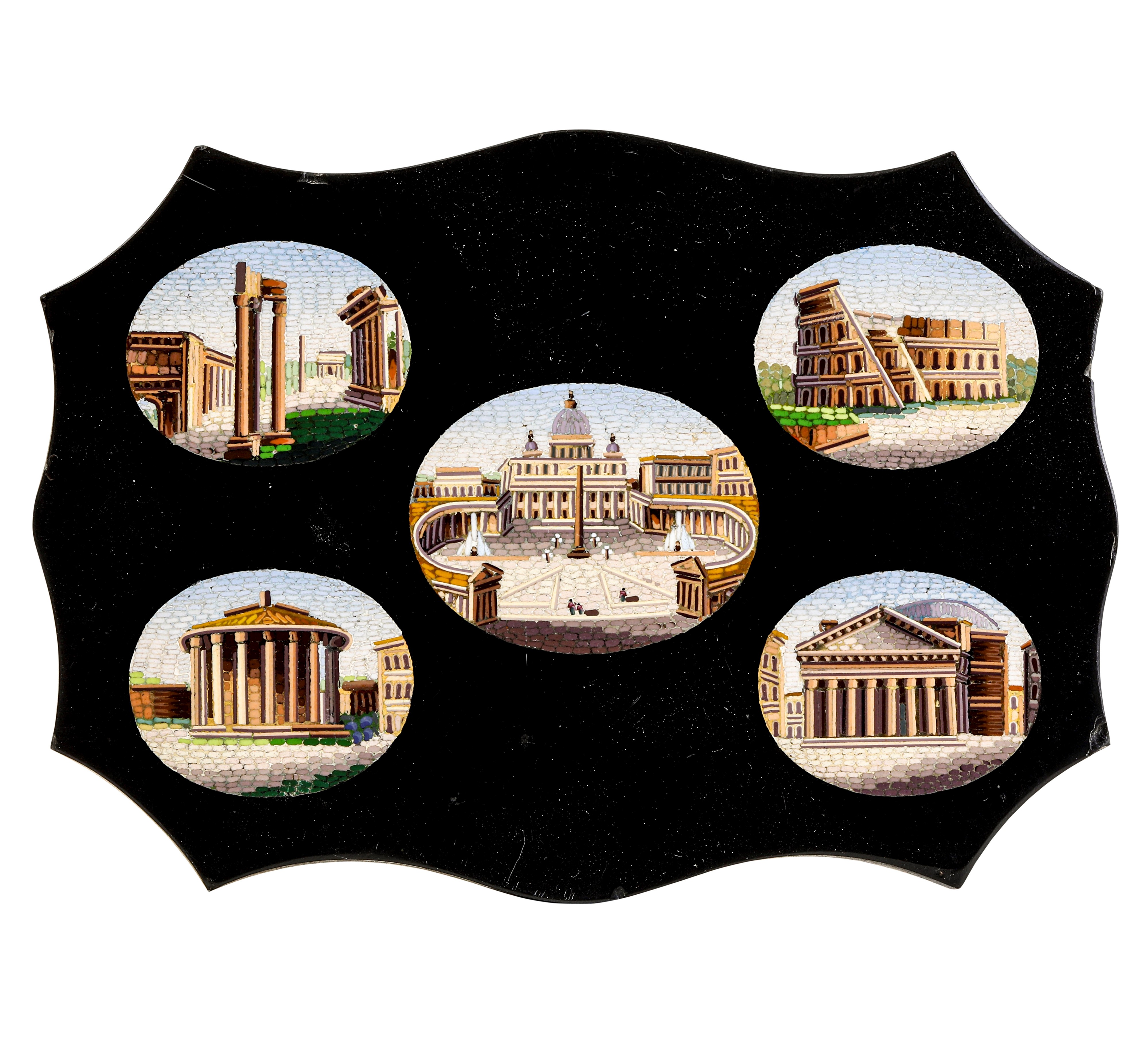 Marmo nero del Belgio sagomato e cinque micromosaici raffiguranti Piazza San Pietro, Colosseo, Pantheon, Fori Imperiali e Tempio di Vesta.