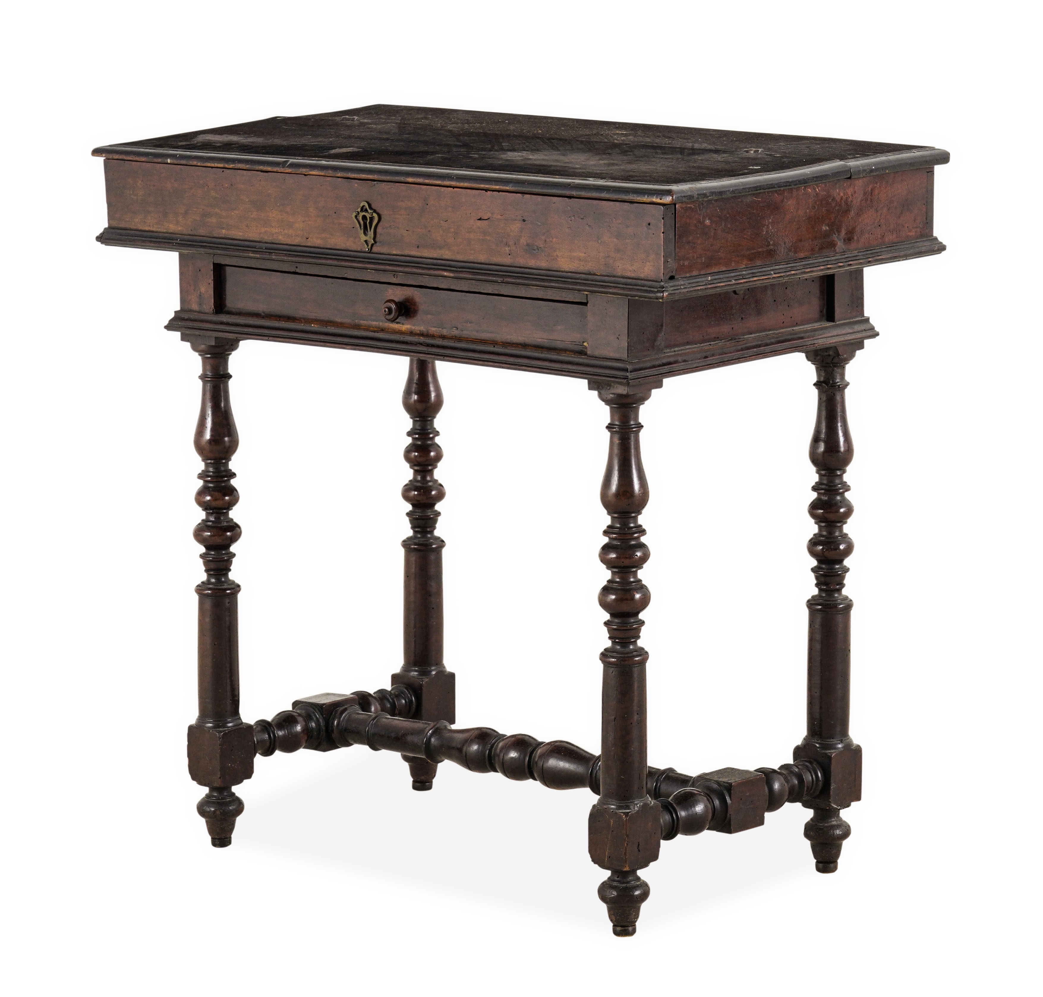 Cassetto nella fascia, piano apribile a ribalta con cassettini, gambe e traverse a rocchetto (restauri)