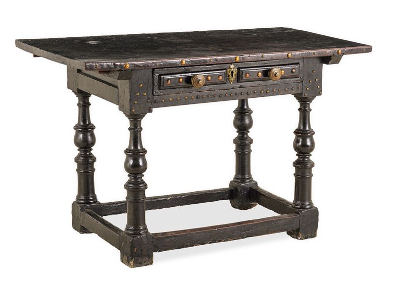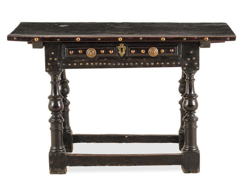 Fascia ad un cassetto pannellato con due formelle squadrate, pomoli in bronzo e ricca decorazione in borchie di bronzo, gambe tornite riunite da traverse dritte