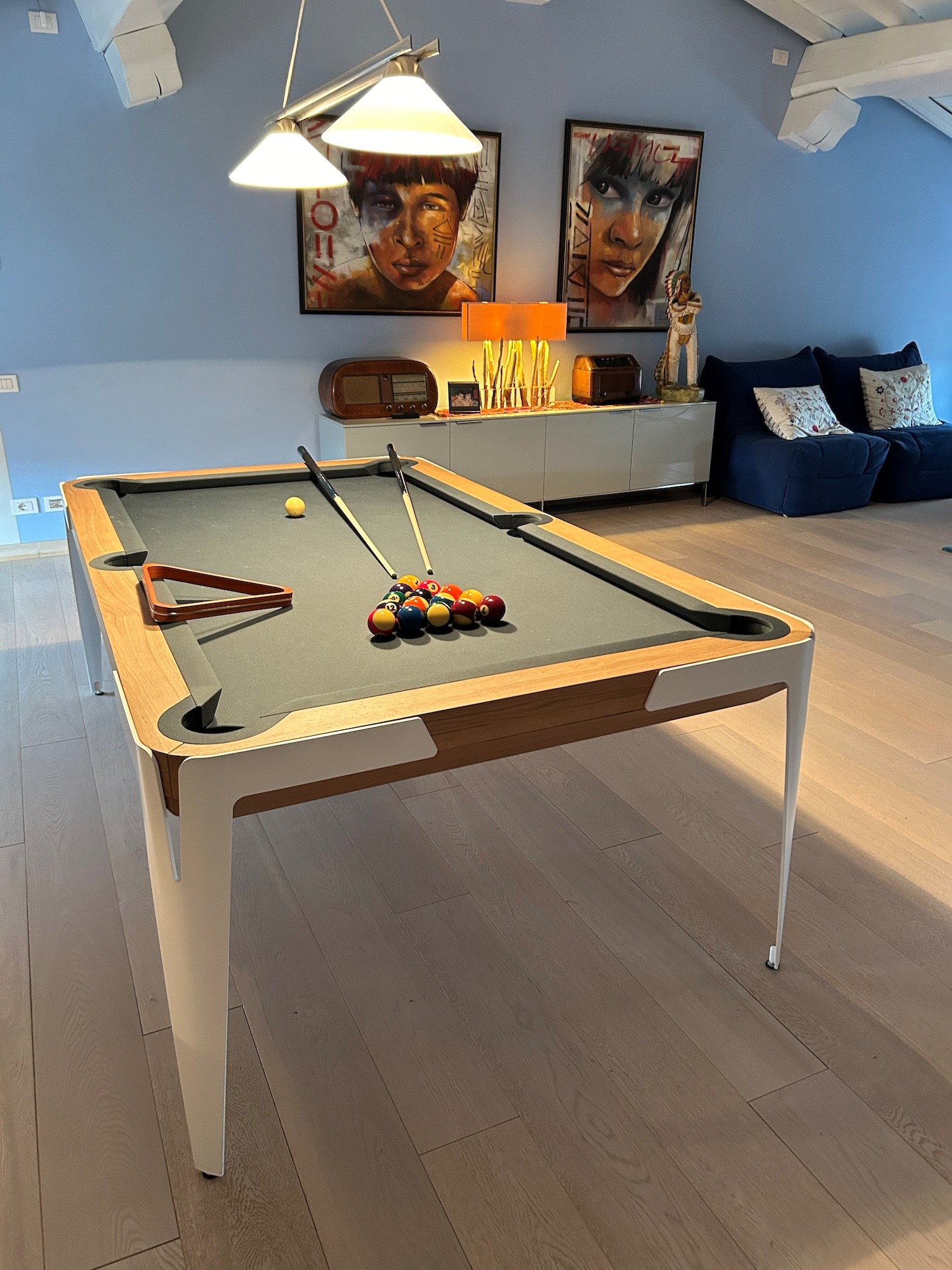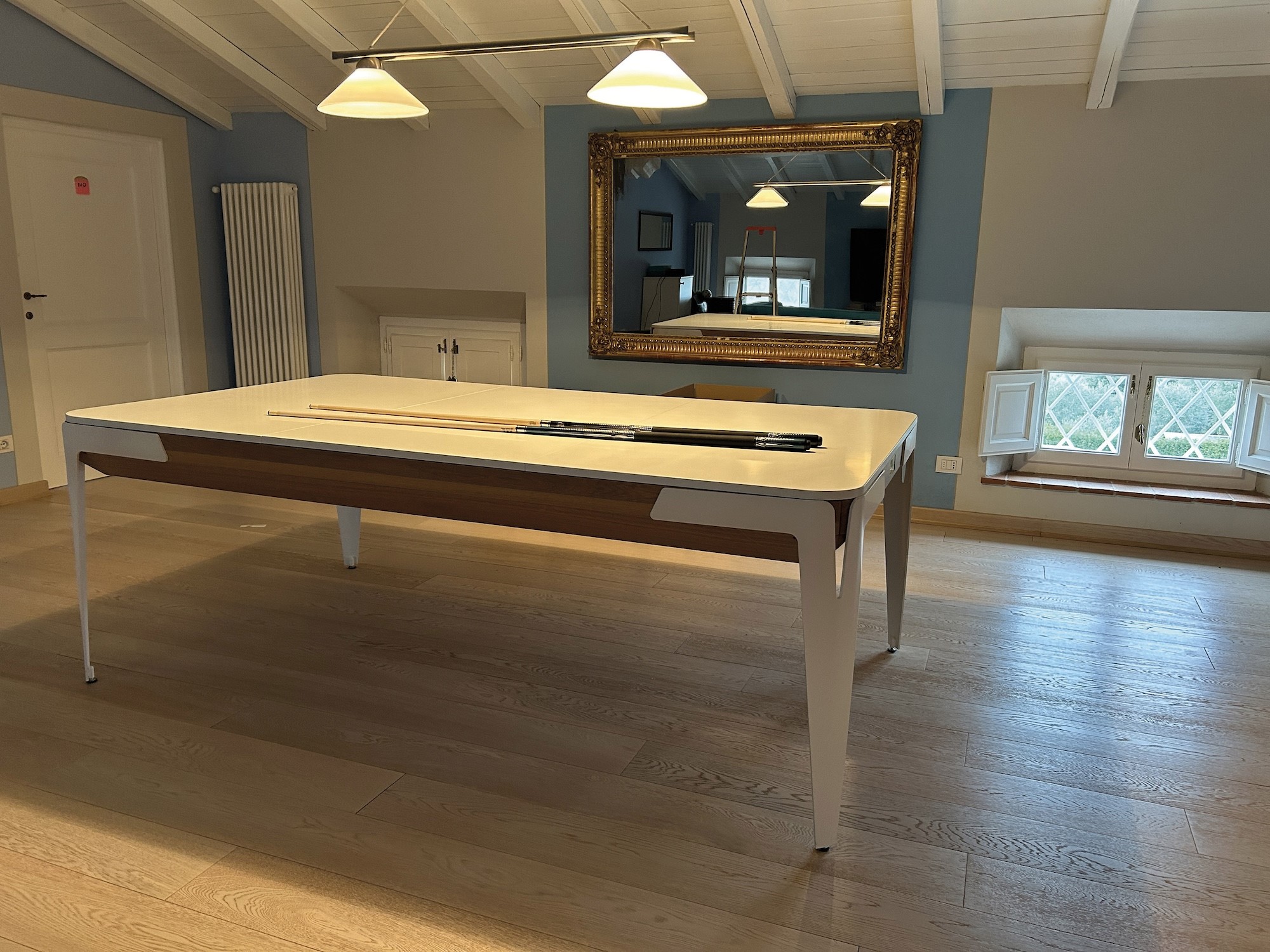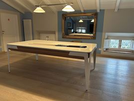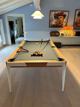 Dotato di stecche, triangolo e copertura del piano di gioco, adattabile a tavolo da pranzo