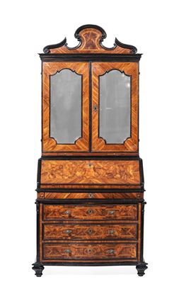 Parte superiore a due ante a vetri, parte inferiore a tre cassetti e anta ribaltabile lastronati in radica, profili e cornicette in legno ebanizzato