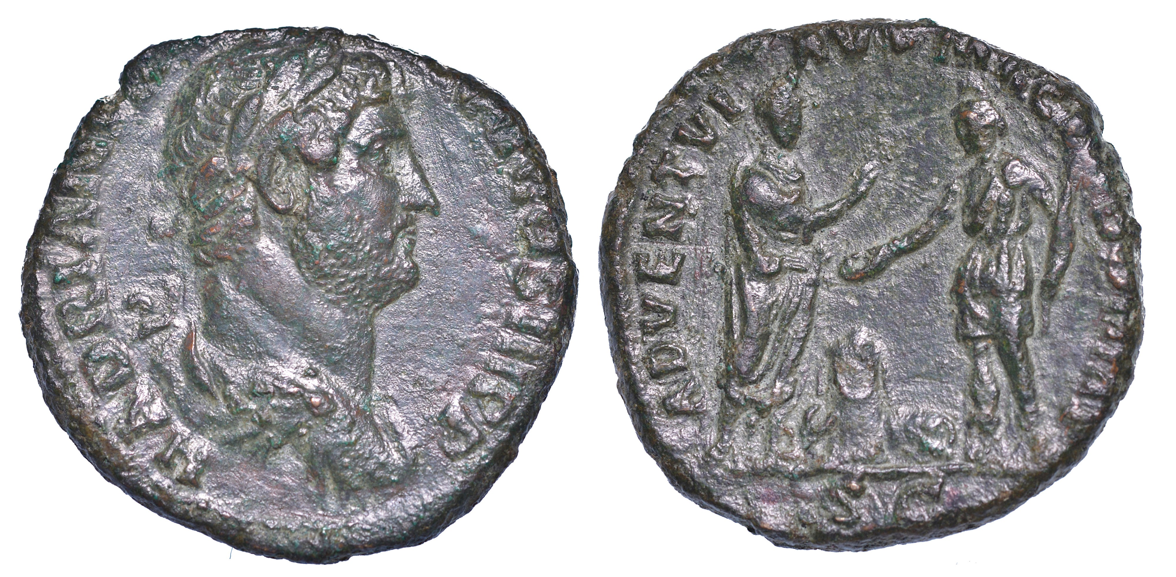 Busto drappeggiato a d. R/ Adriano, togato, in piedi a s., saluta la Macedonia a d. che tiene patera sopra l'altare e lungo bastone; dietro l'altare, toro sacrificale ucciso. Coh. 60. RIC 1781. BMC 1662. Raro. g. 10,08. Diam. mm. 25,51. Bronzo. Patina verde. BB/SPL