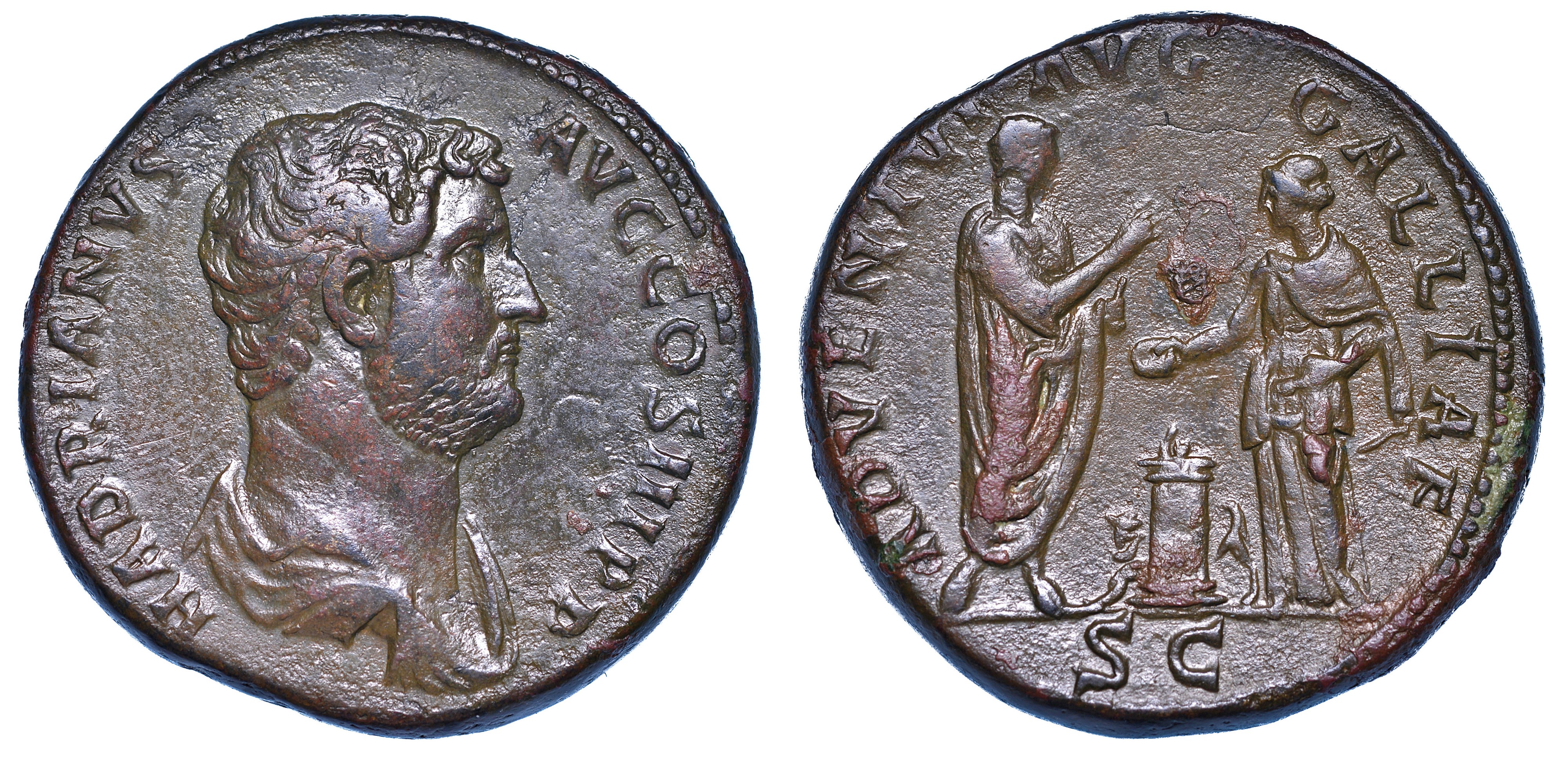 Busto drappeggiato a d. R/ Adriano in piedi verso d. regge un rotolo e saluta con la mano d. la Gallia che sacrifica con una patera sopra un altare e tiene una scatola di incenso. Coh. 31. RIC 1745. BMC 1643. Raro. g. 25,02. Diam. mm. 30,62. Bronzo. Patina marrone. BB