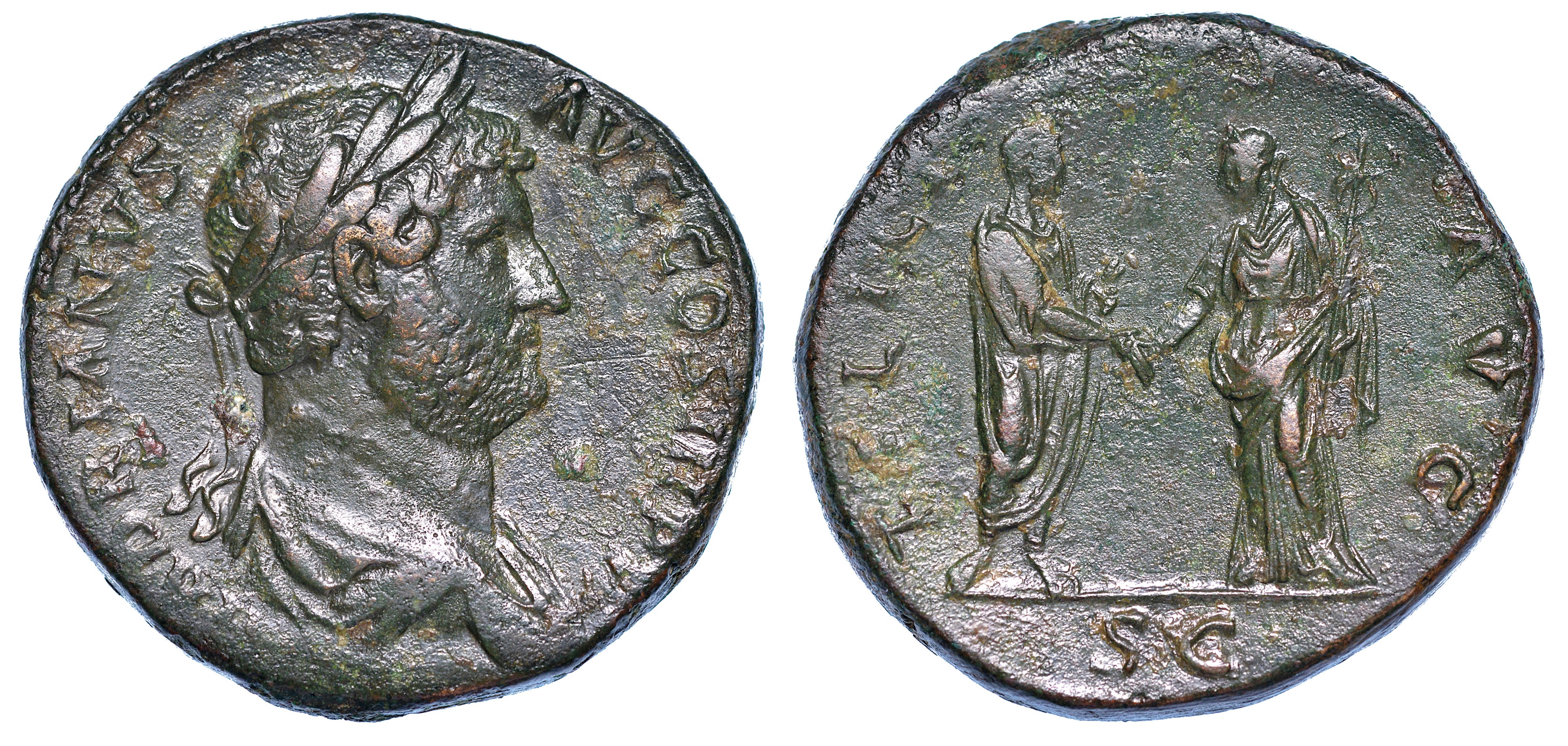 Busto laureato e drappeggiato a d. R/ Imperatore in piedi a s. tiene un rotolo e stringe la mano alla Felicitas, in piedi a d., con in mano un caduceo. Coh. 636. RIC 2086. g. 25,90. Diam. mm. 30,33. Bronzo. Patina verde. BB