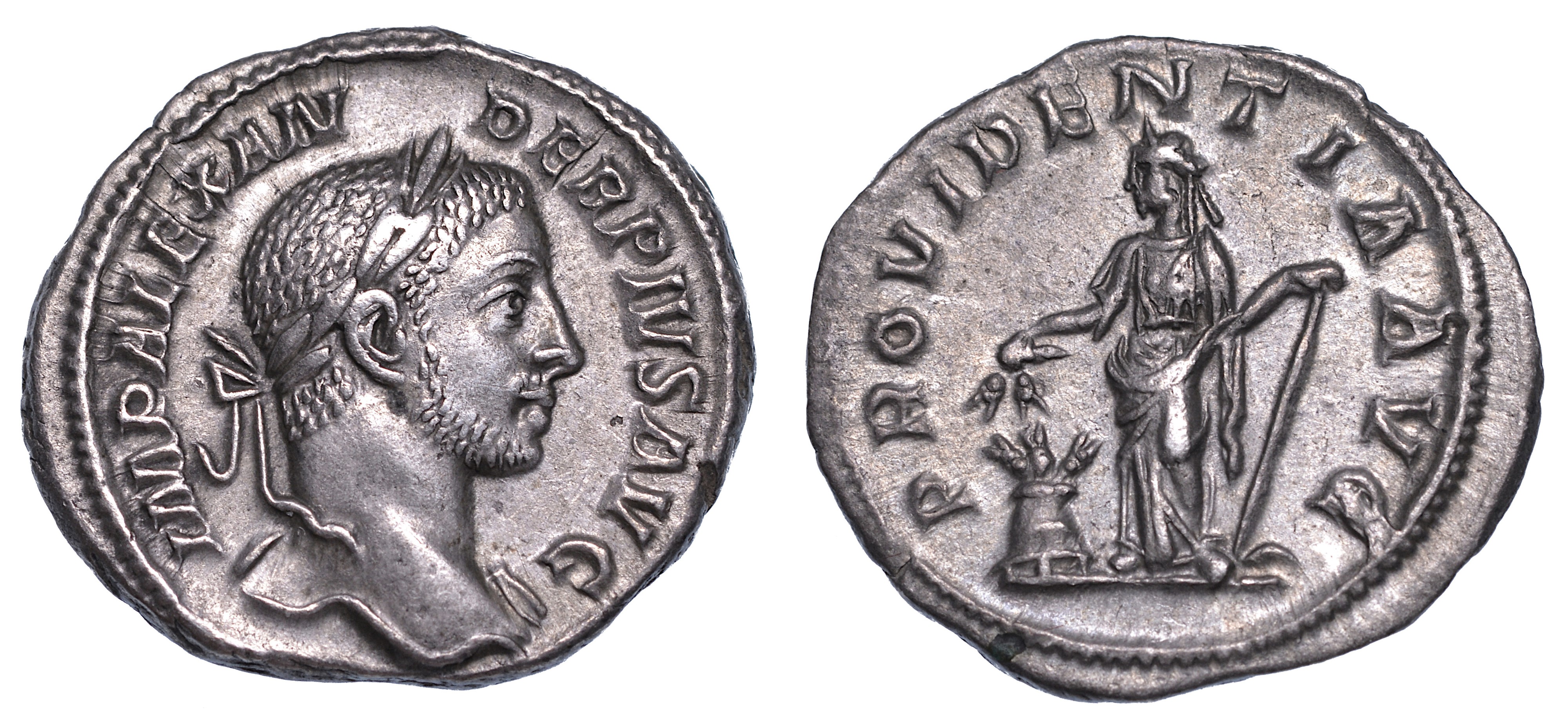 Busto laureato a d. R/ La Providentia, stante a s., regge ancora e spighe di grano; a s. modius pieno di spighe di grano. Coh. 508. RIC 252. g. 3,24. Diam. mm. 18,20. Arg. BB/q.SPL