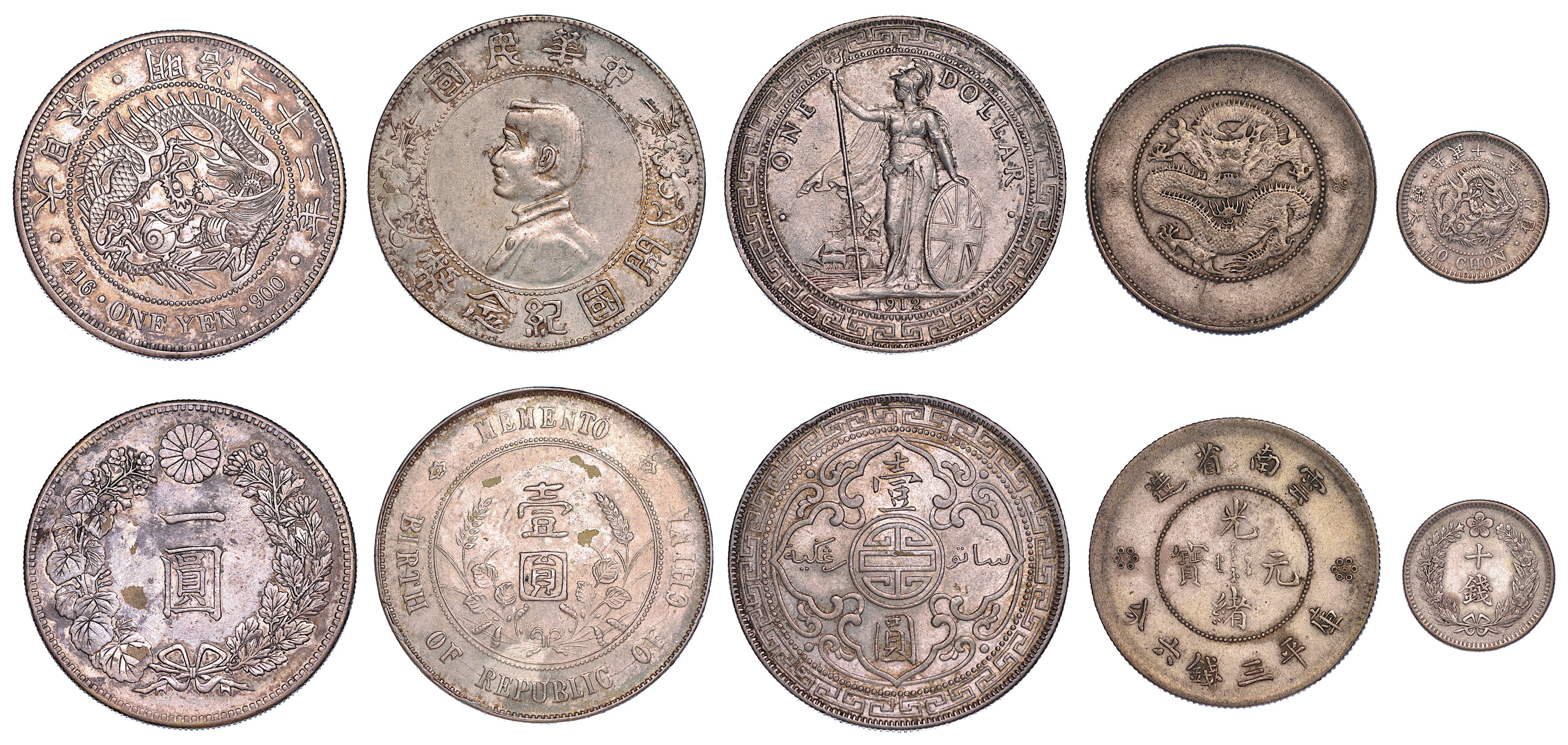 Monetazione mista dell’area estremo-orientale fra cui si segnalano: CINA. REPUBLIC, 1912-1949. Dollar (1927). GIAPPONE. MUTSUHITO, 1867-1912. Yen. REGNO UNITO. GEORGE V, 1910-1936. Trade Dollar 1912. Esemplari in argento e ceramica. Conservazioni da q.BB a SPL.