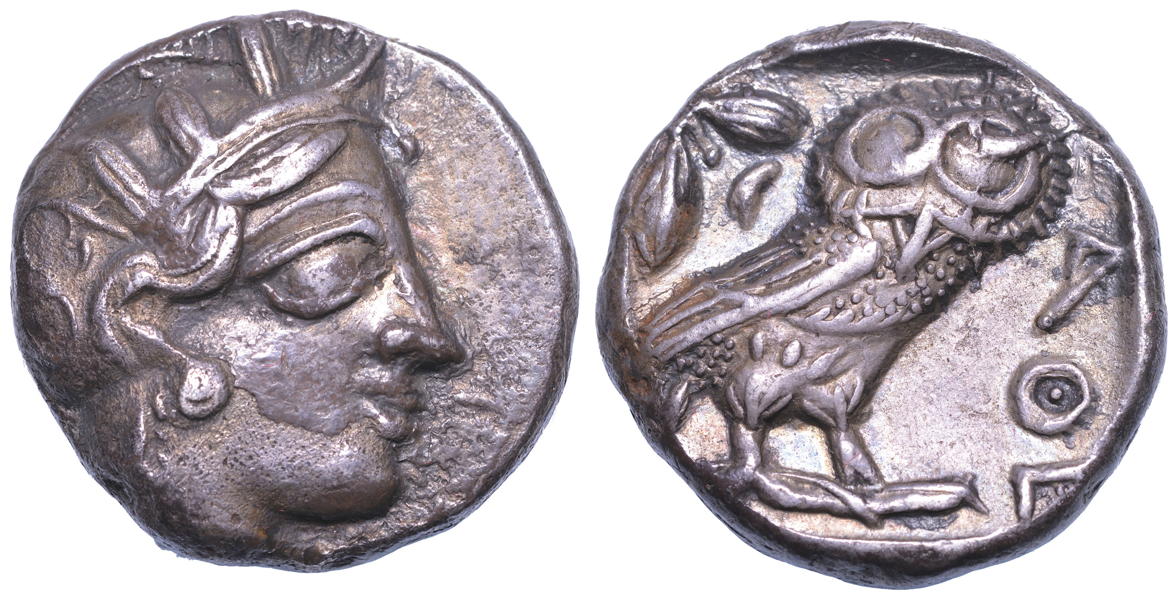 Testa elmata di Athena a d. R/ Civetta; dietro, crescente lunare e ramo di ulivo. Sear 2526. g. 16,87. Diam. mm. 24,18. Arg. Lievi graffi sul contorno. BB