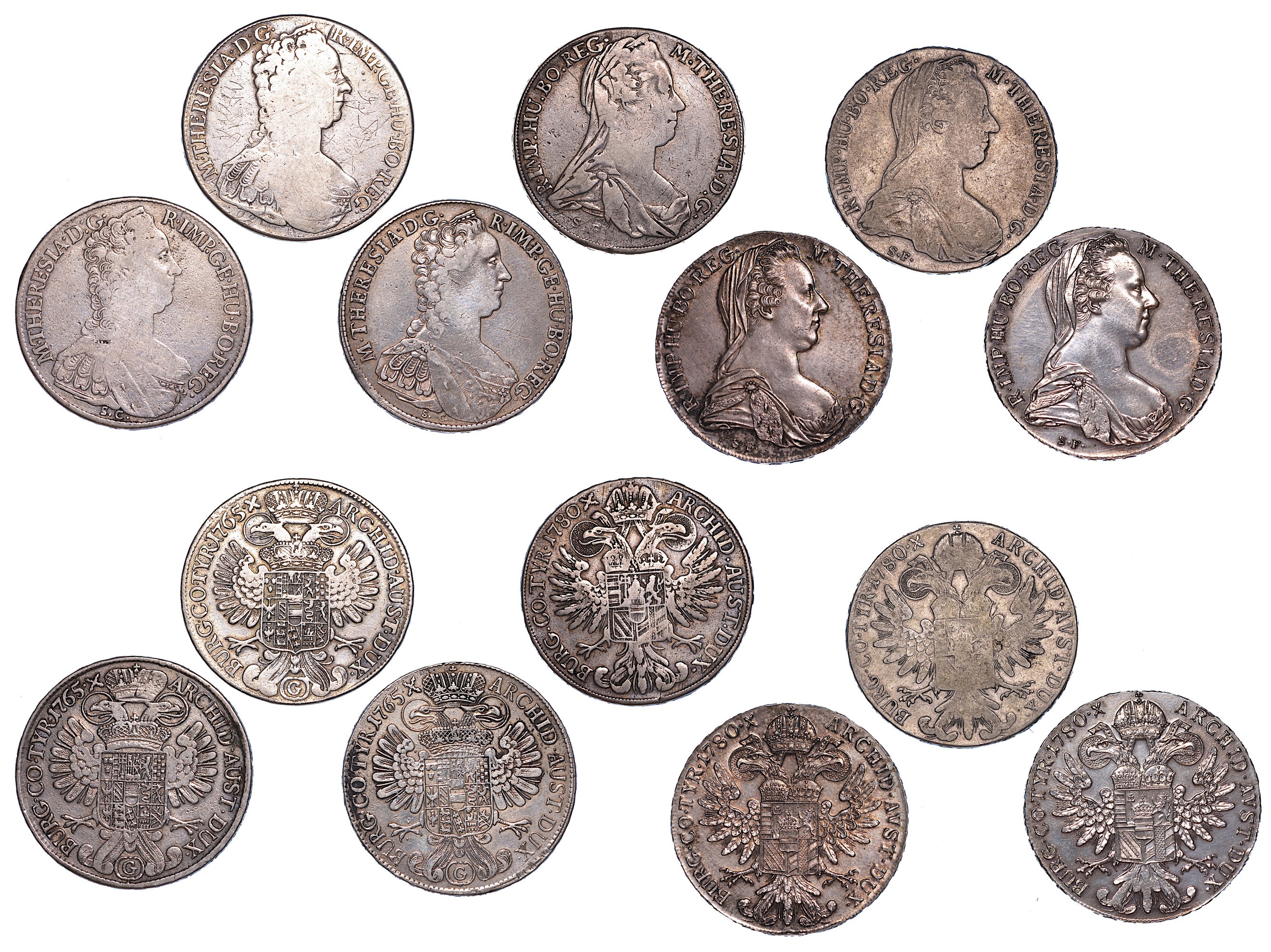 Interessante lotto composto da talleri di Maria Teresa d'Austria dei seguenti anni: 1765 (3 esemplari) - 1780 (4 esemplari di cui 3 riconi). Esemplari in argento. Conservazioni da B/MB a SPL.