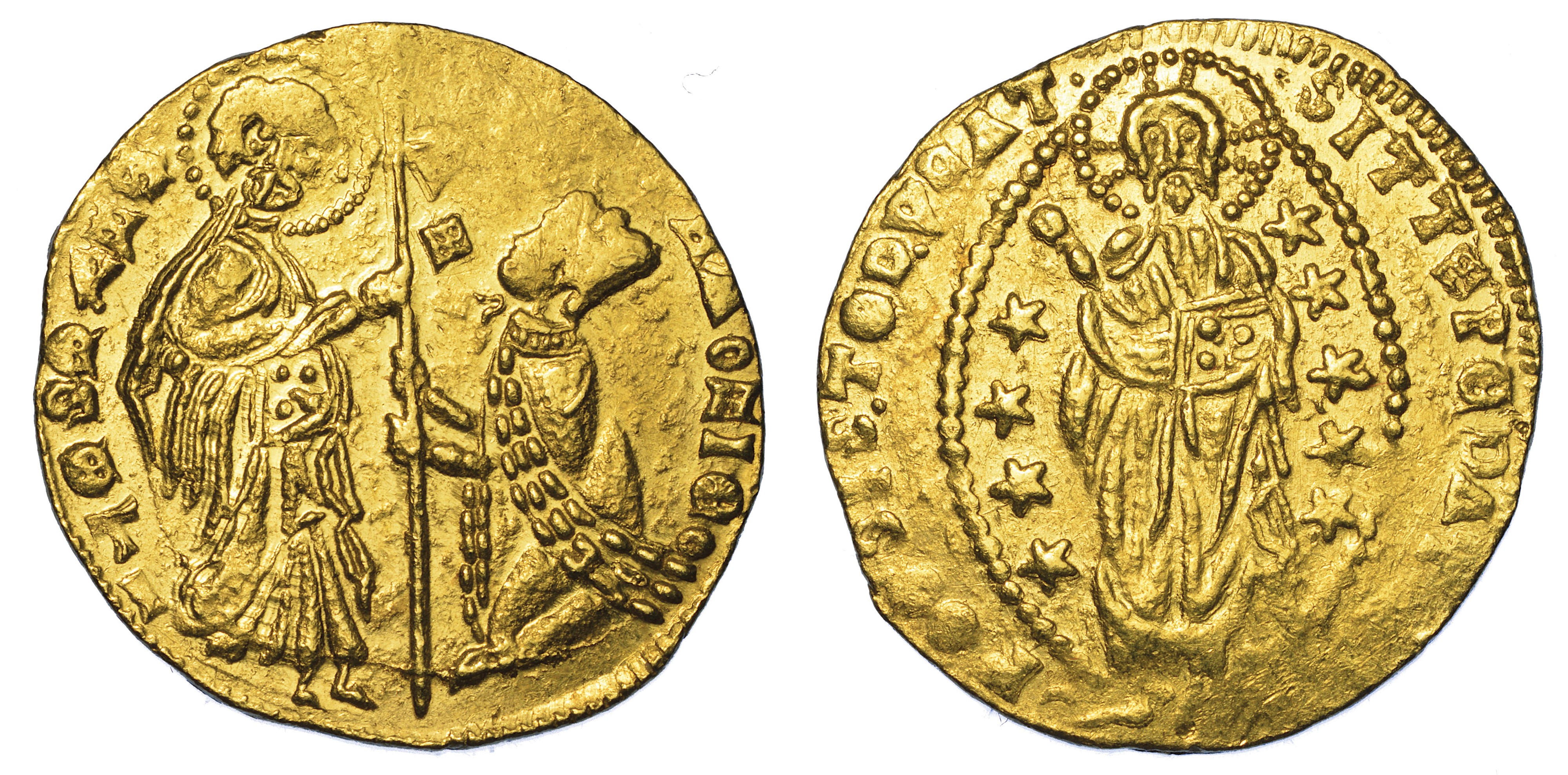 Il Santo in piedi porge il vessillo al doge genuflesso. R/ Il Redentore in piedi in aureola ellittica. Gamb 344. Lunardi CS6. g. 3,51. Diam. mm. 19,63. Oro. Migliore di BB