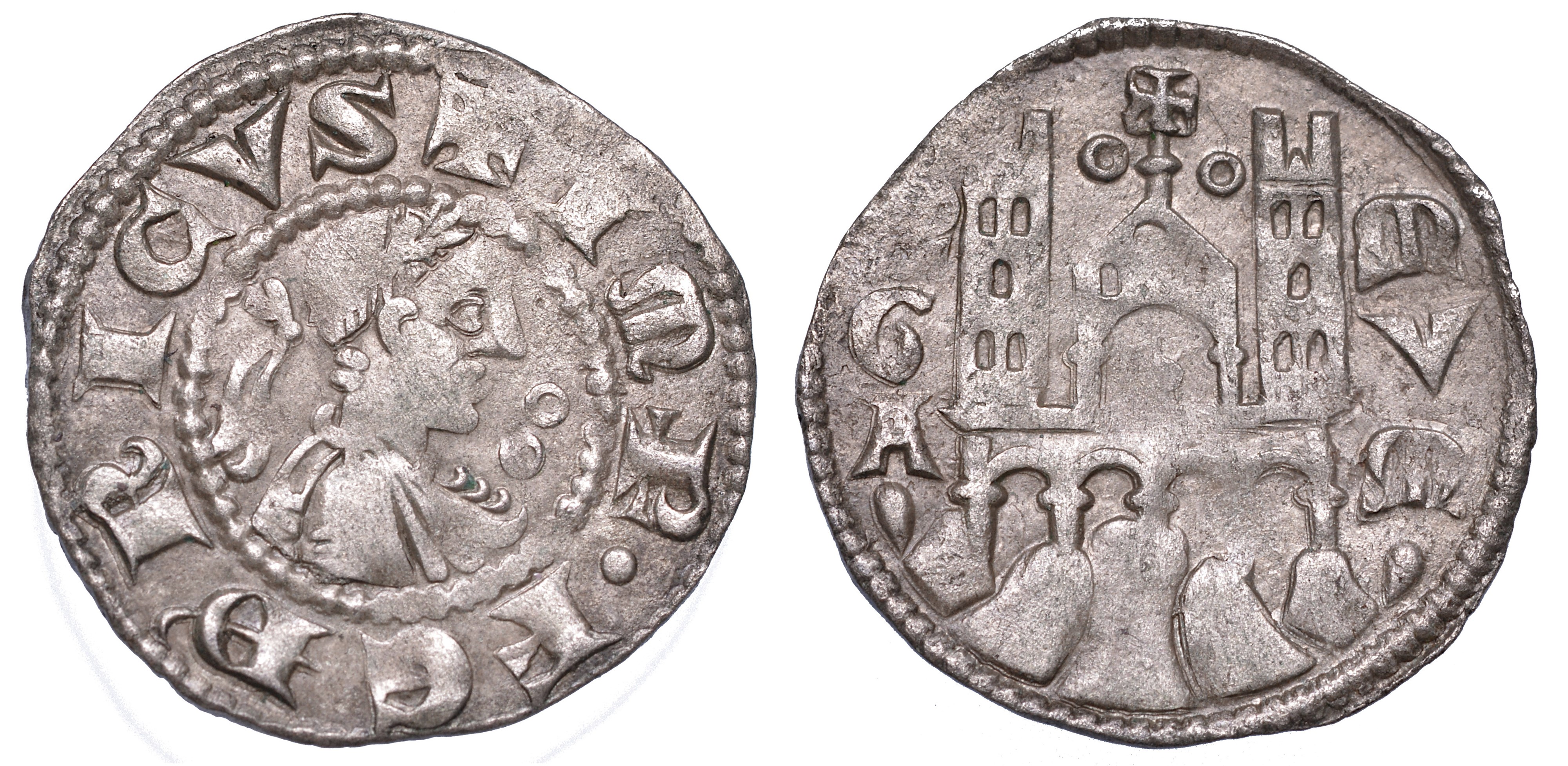 Busto laureato a d. in cerchio perlinato; nel campo a d. segno a forma di due cuori opposti. R/ Edificio centrale ad un arco con tetto a tre spioventi; sulla sinistra della cuspide, segno O. All'interno dell'arco, bisante. Al vertice, bisante e croce; ai lati, due torri merlate a cinque finestre. Alla base, quattro archi di mura su terreno roccioso. MIR 18. g. 0,86. Diam. mm. 17,00. Mist. BB