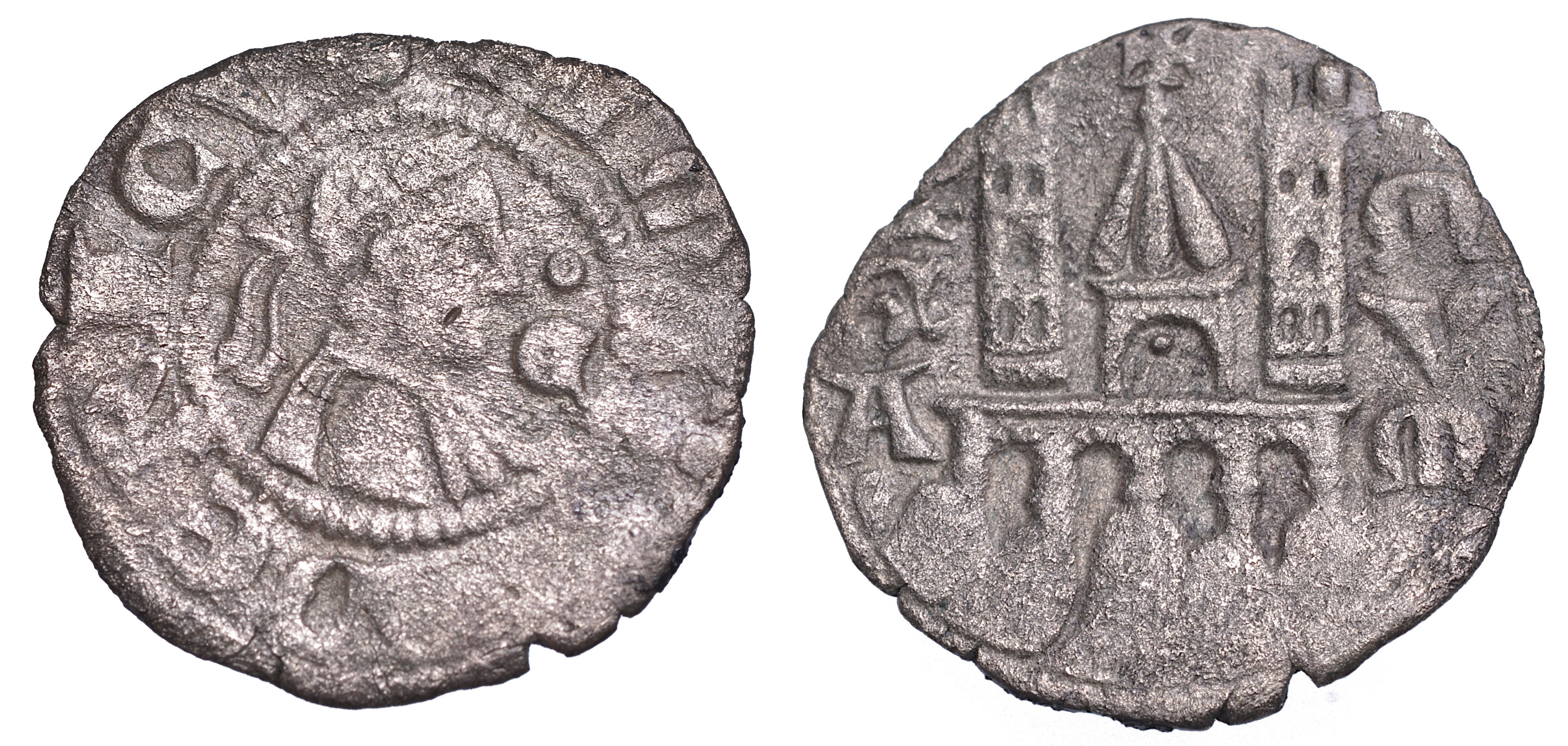 Busto laureato a d. in cerchio perlinato, nel campo, a d. lettera E sormontata da anello. R/ Edificio centrale ad un arco con tetto a tre spioventi; all'interno dell'arco, bisante. Al vertice, bisante e croce; ai lati, due torri merlate a cinque finestre. Alla base, quattro archi di mura su terreno roccioso. MIR 18. Varietà con lettera E davanti al busto al diritto. Raro. g. 0,71. Diam. mm. 15,50. Mist. MB