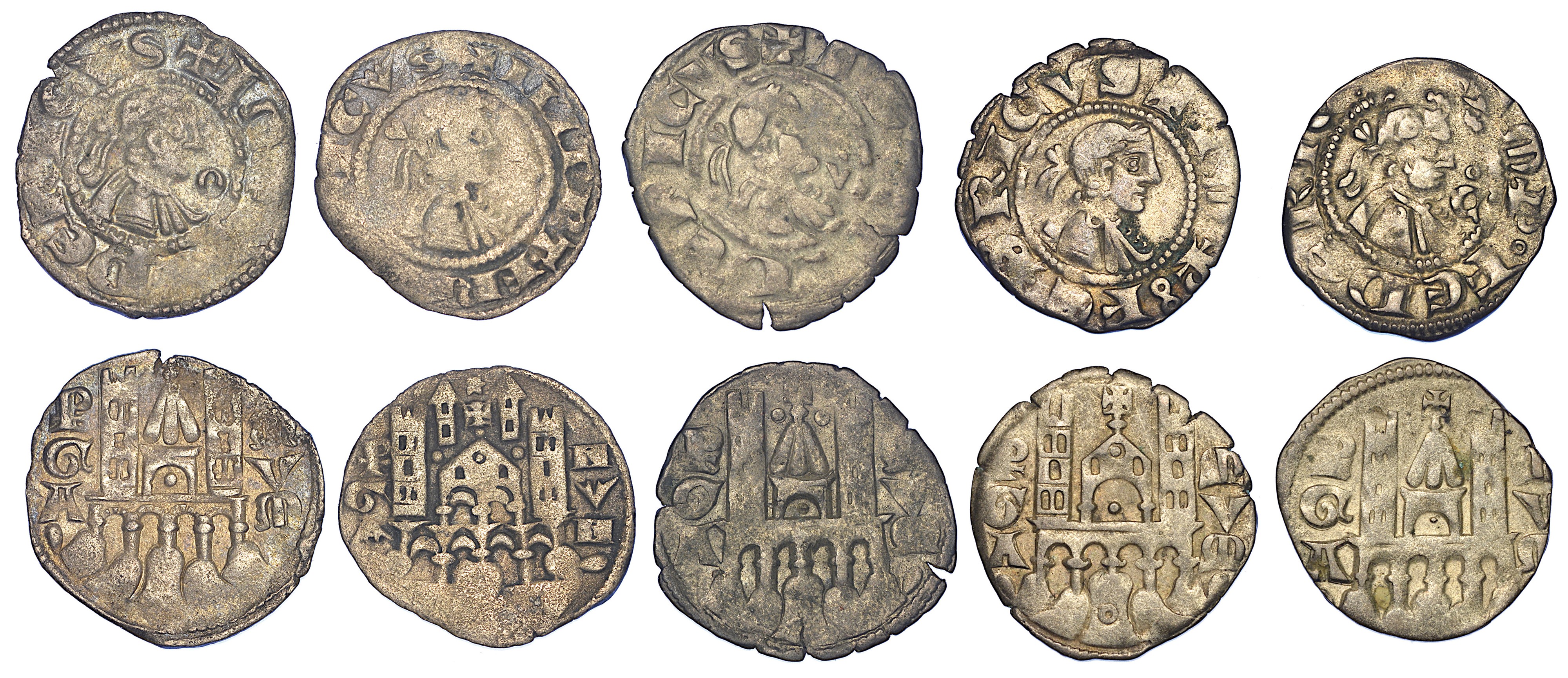 COMUNE, A NOME DI FEDERICO II, 1194-1250. Denaro planeto (5 esemplari). Busto laureato a d. in cerchio perlinato. R/ Edificio centrale ad un arco con tetto a capanna. Ai lati, due torri merlate. Alla base, quattro archi di mura su terreno roccioso. MIR 18. Raro. Esemplari in mistura. Conservazioni da MB a q.BB.