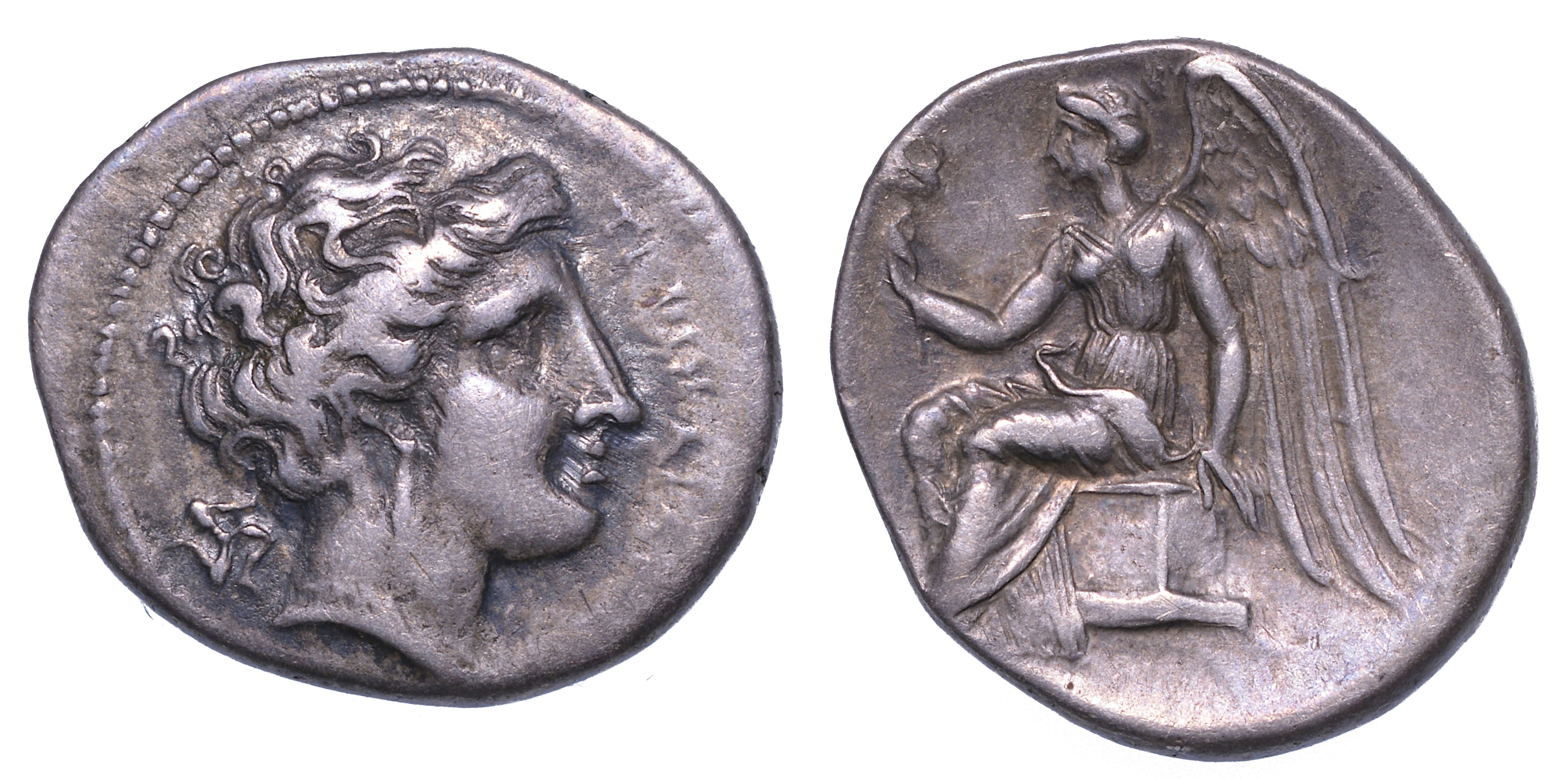 Testa della ninfa Terina a d.; dietro, triscele. R/ Nike seduta su cippo a s. regge caduceo. HN Italia 2641. HGC 1, 1766. g. 2,23. Diam. mm. 14,94. Arg. q.BB