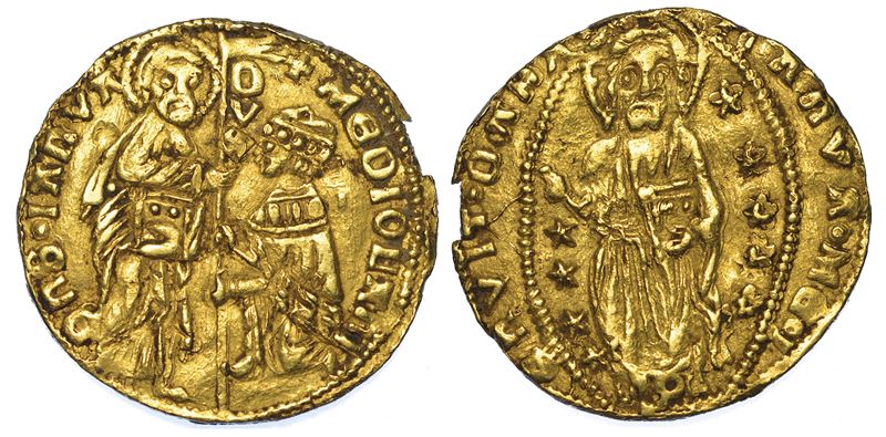 DNS IANVA MEDIOLANI DVX Il Santo consegna il vessillo al Doge genuflesso; alla base del vessillo S. R/ IANVA ME IERVIT CARA Il Redentore benedicente entro ellisse; in mezzo ai piedi lettera P. Mazarakis p. 69 var. Estremamente raro. g. 3,50. Diam. mm. 20,57. Oro. BB
