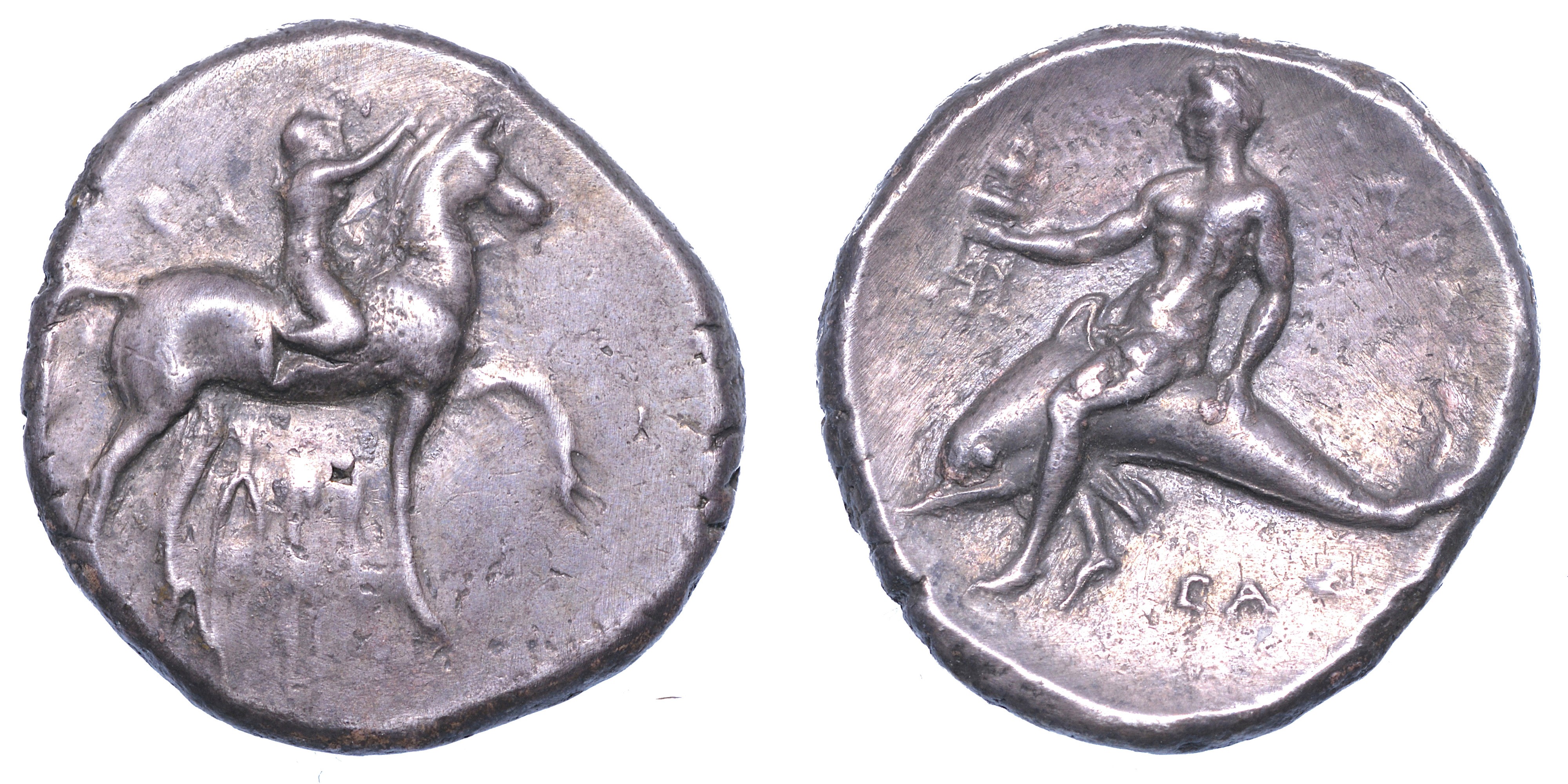 Cavaliere verso d. incorona il cavallo con ghirlanda. R/ Phalanthos cavalca un delfino a s., con in mano un treppiede; sotto, nome del magistrato CAΣ. Vlasto 666-7. HN Italia 957. g. 7,56. Diam. mm. 22,34. Arg. Bel modulo largo. BB