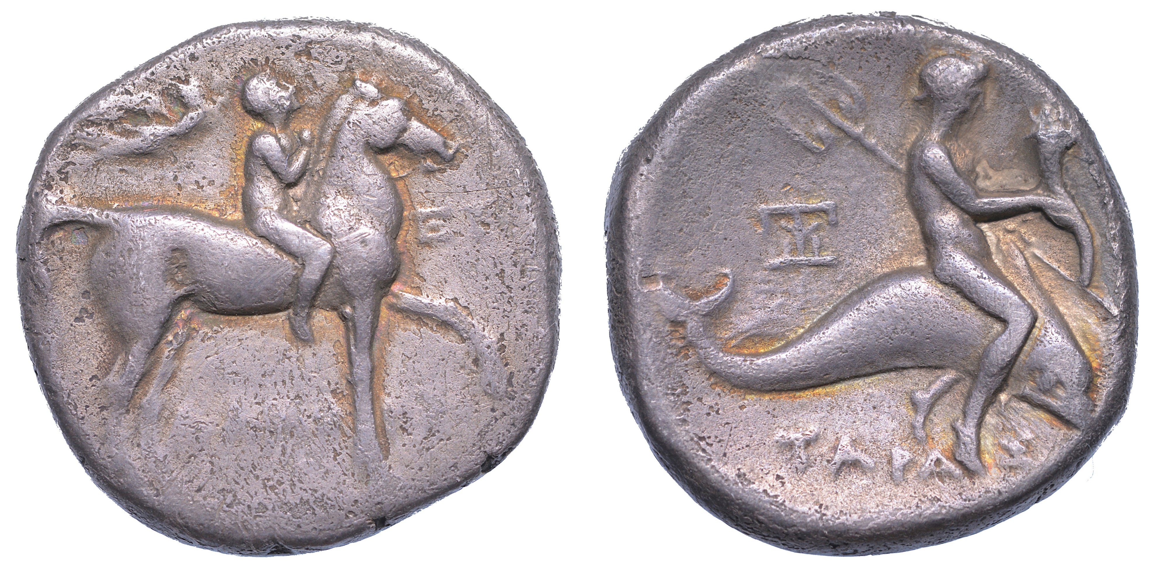 Giovane cavaliere avanza verso d.; in alto a s. Nike in volo. R/ Taras nudo cavalca un delfino reggendo cornucopia e tridente; a s. monogramma. HN Italia 1043. Vlasto 918. g.6,01. Diam. mm. 19,44. Arg. MB/BB