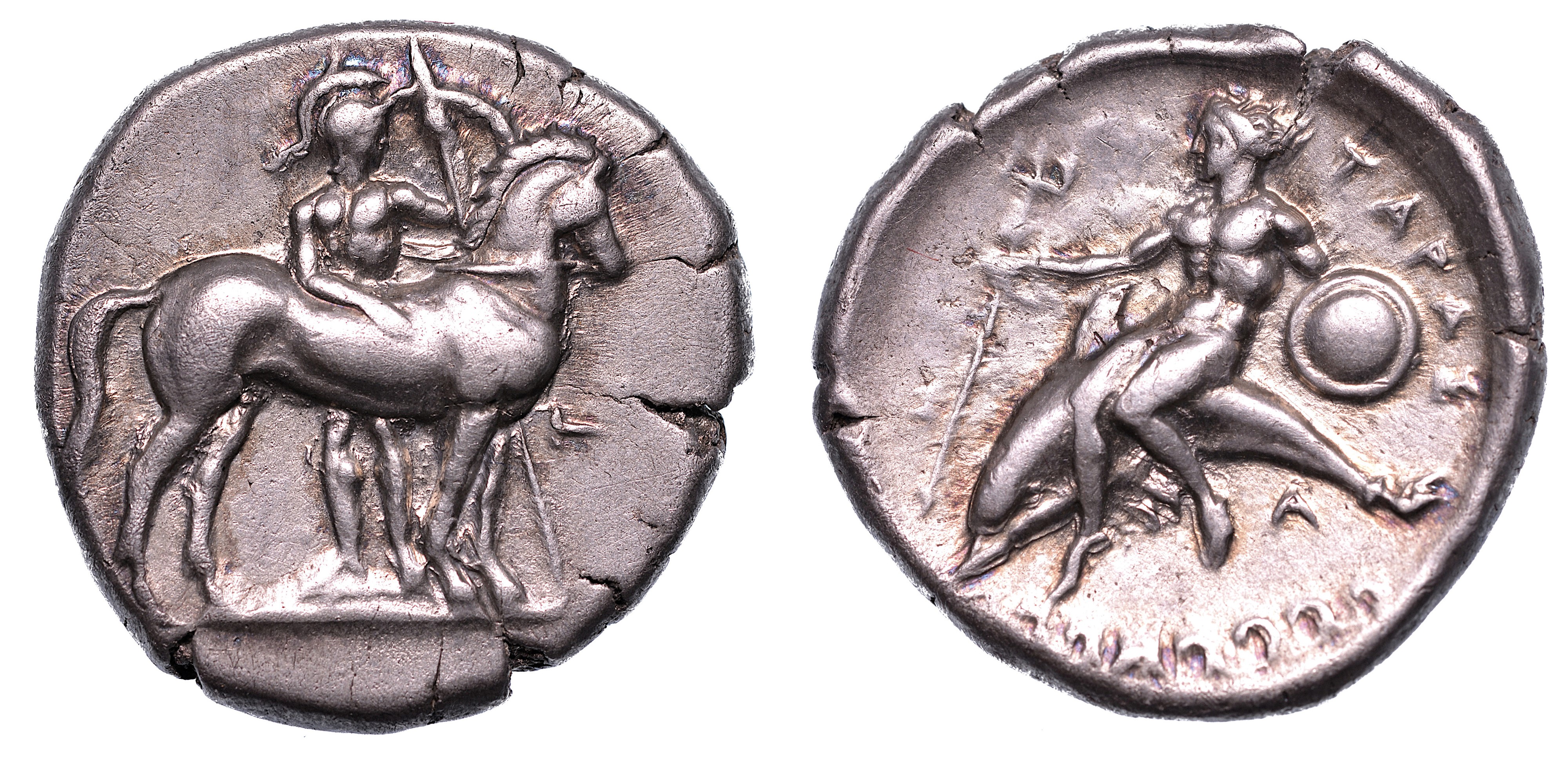 Efebo stante, nudo ed elmato, tiene lancia e scudo; davanti, cavallo verso d.; a d., T orizzontale. R/ Taras cavalca delfino a s. e tiene tridente e scudo; sotto, A. Vlasto 518. SNG Fitzwilliam 263. Fisher-Bossert 684t. Historia Numorum Italia 889. g. 7,78. Diam. mm. 22,28. Arg. Modulo largo e bellissimo conio centrato. SPL