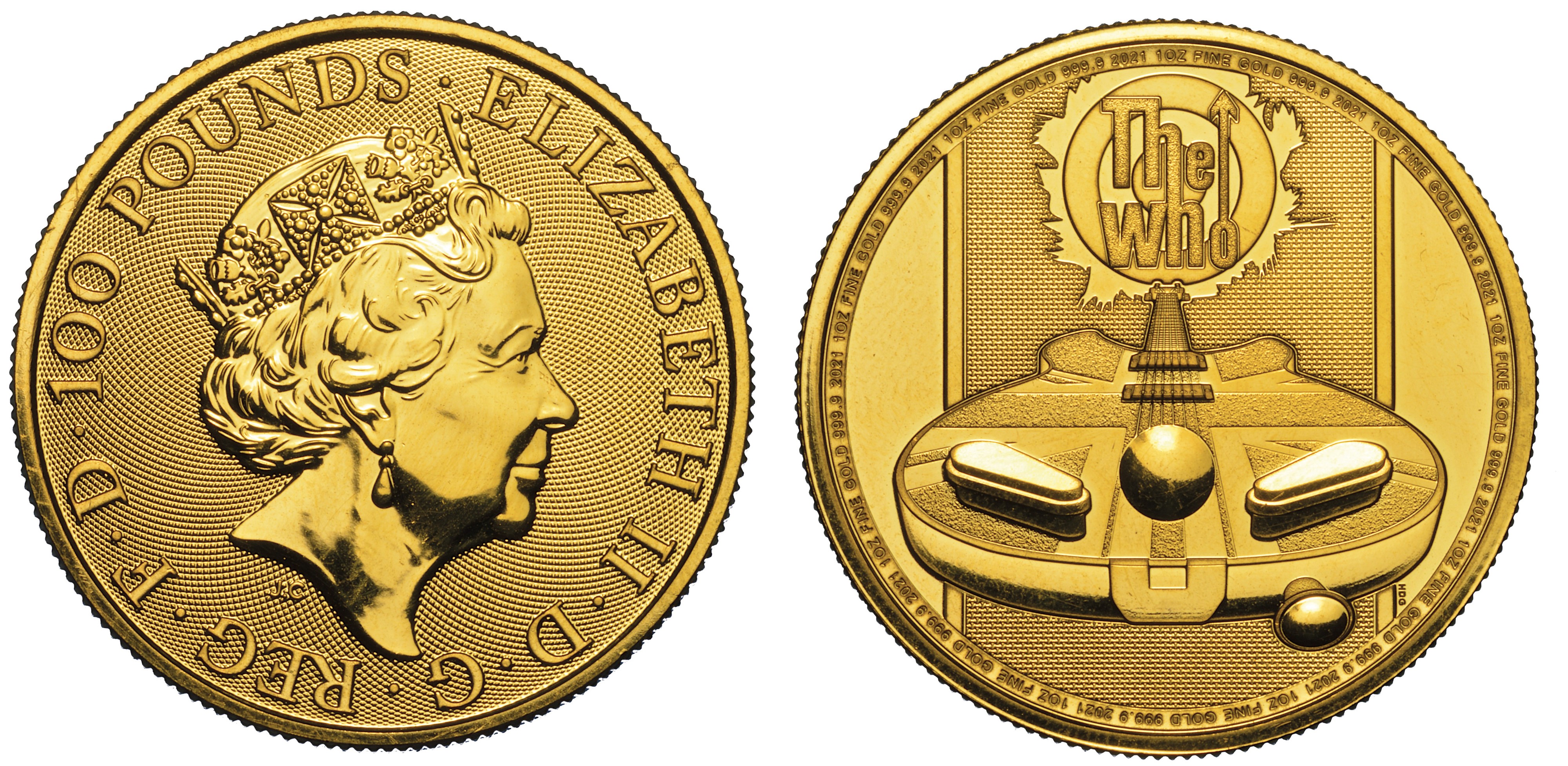 Testa coronata di Elisabetta II a d. R/ Chitarra elettrica sormontata da nome della banda “The Who”. g. 31,21. Diam. mm. 32,52. Oro (titolo 999,9). FDC