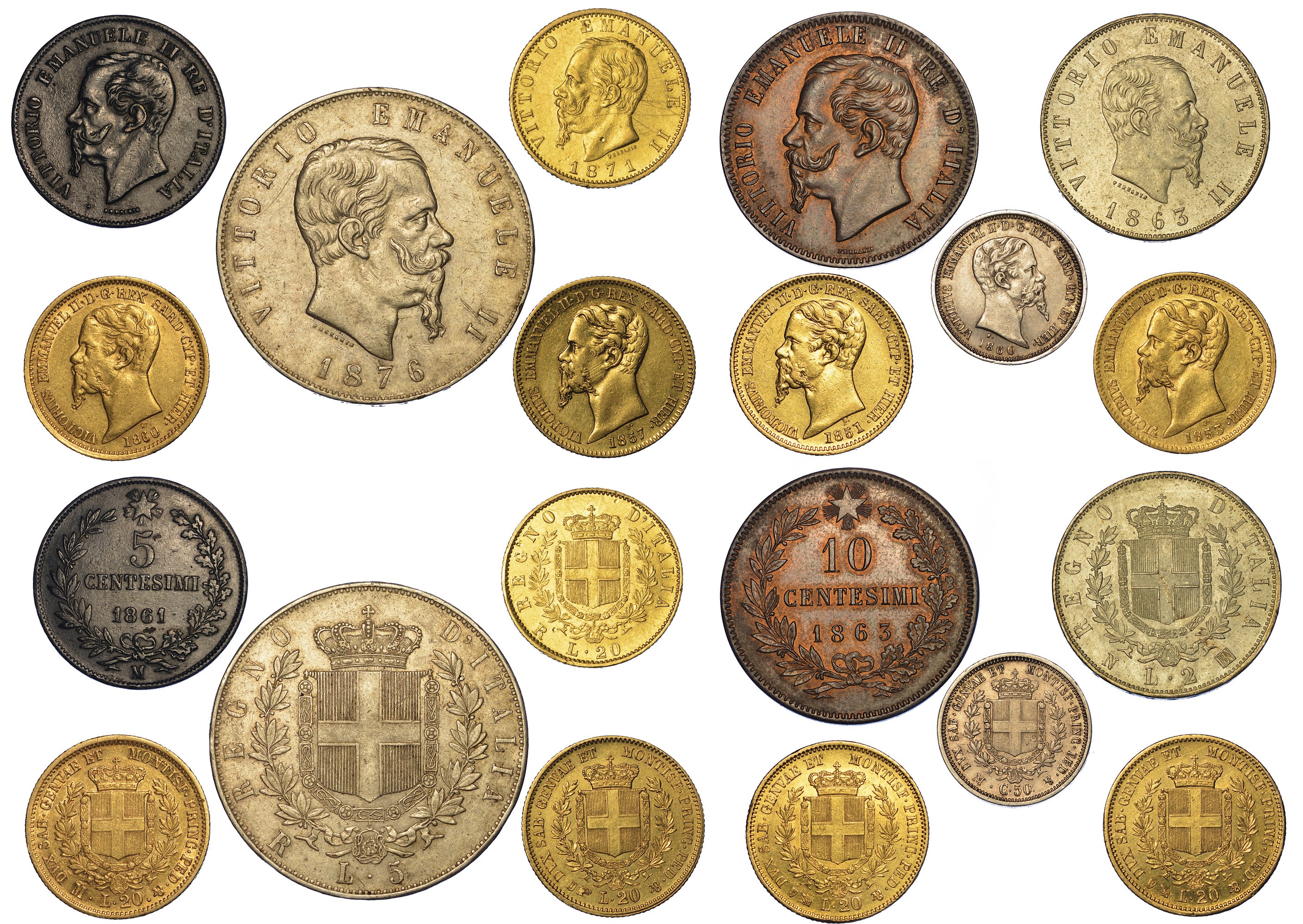 RE DI SARDEGNA, 1849-1861. 20 Lire 1851 G - 20 Lire 1853 G - 20 Lire 1857 T - 20 Lire 1860 M - 50 Centesimi 1860 M. RE D’ITALIA, 1861-1878. 20 Lire 1871 R (raro) - 5 Lire 1877 R - 2 Lire 1863 N (cartellino Carlo Crippa) - 10 Centesimi 1867 CM - 5 Centesimi 1867 M. Esemplari in oro, argento e rame. Conservazioni da q.BB a q.FDC.