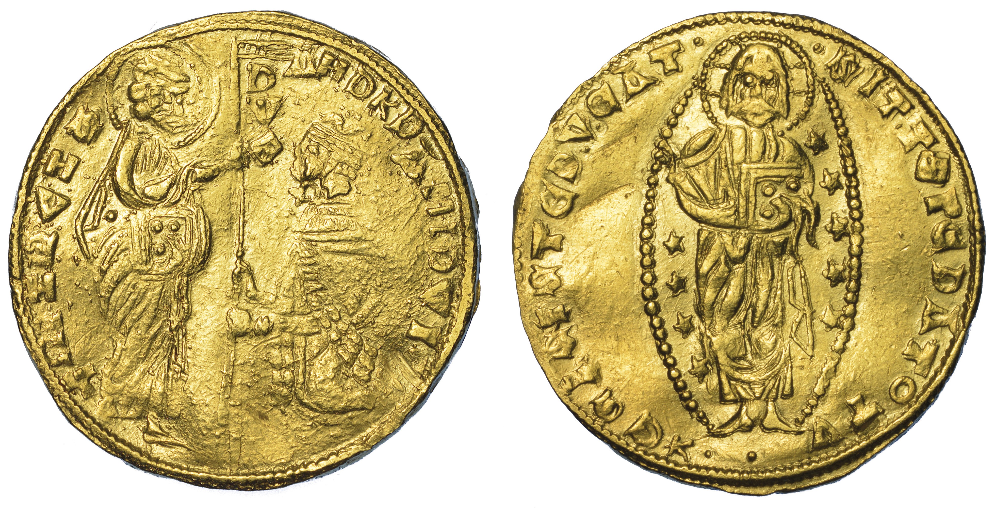 Il Santo in piedi porge il vessillo al doge genuflesso. R/ Il Redentore in piedi in aureola ellittica. Gamb 344. Lunardi CS6. g. 3,47. Diam. mm. 22,28. Elettro. BB/SPL