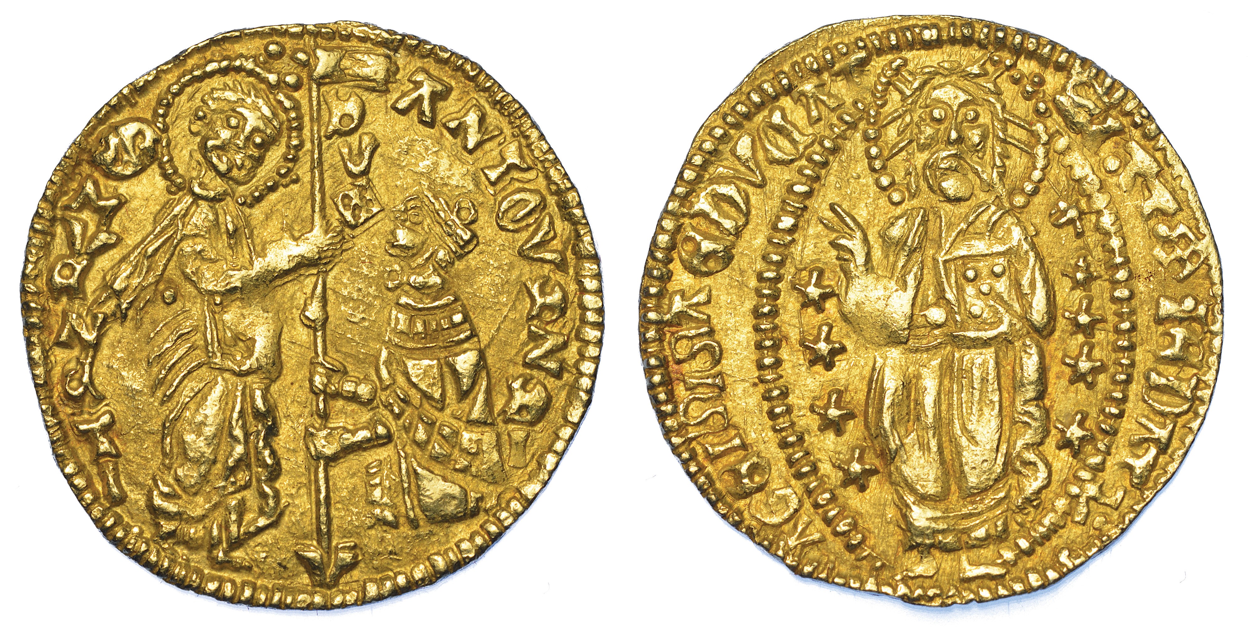 Il Santo consegna il vessillo al Doge genuflesso. R/ Il Redentore benedicente entro ellisse. Gamb. 394. Lunardi CS12 v. Raro. g. 3,52. Diam. mm. 21,45. Oro. BB/q.SPL