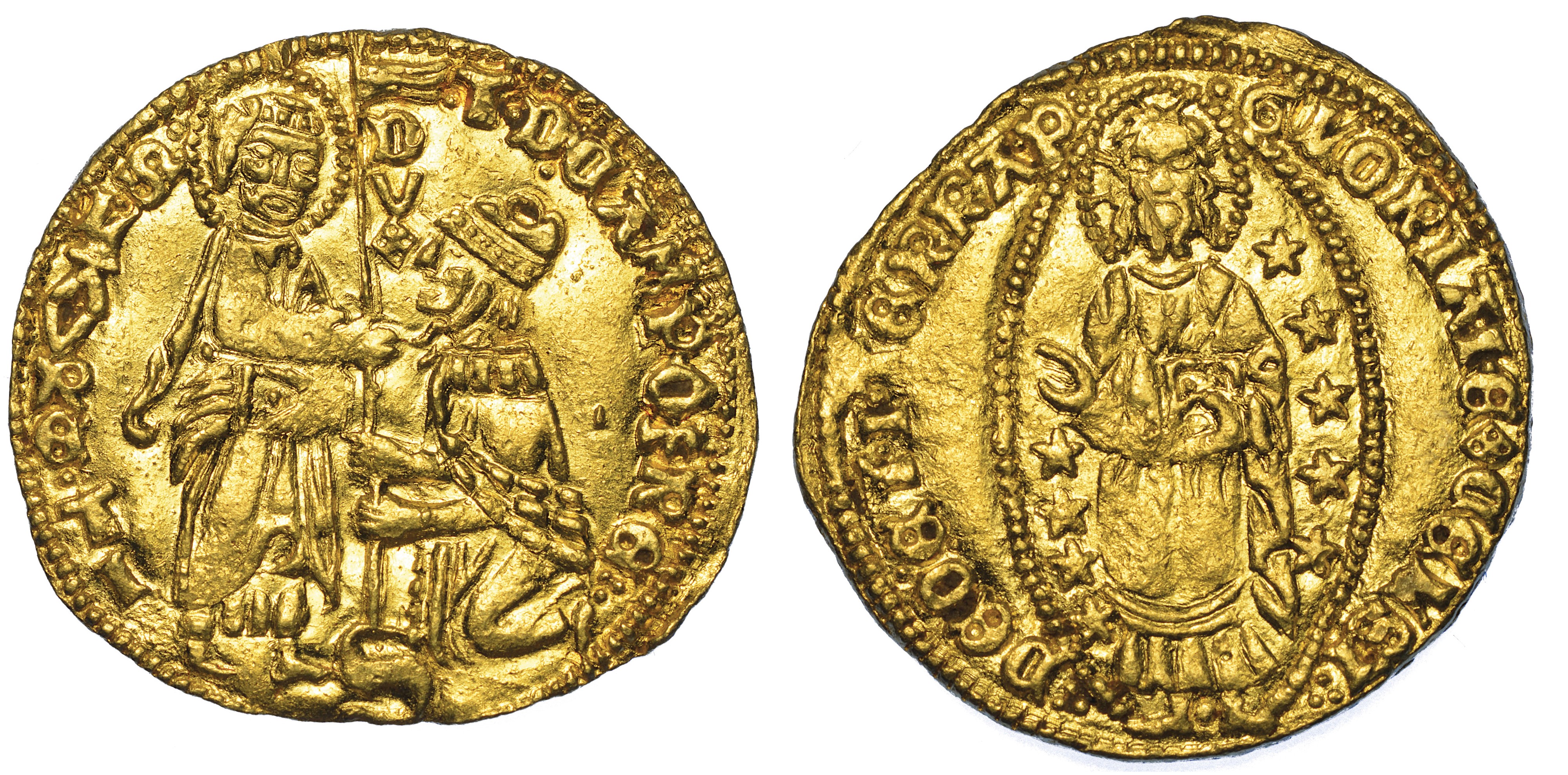 Il Santo consegna il vessillo al Doge genuflesso. R/ Il Redentore benedicente entro ellisse. Gamb. 397. Lunardi S20. Rarissimo. g. 3,53. Diam. mm. 19,76. Oro. SPL