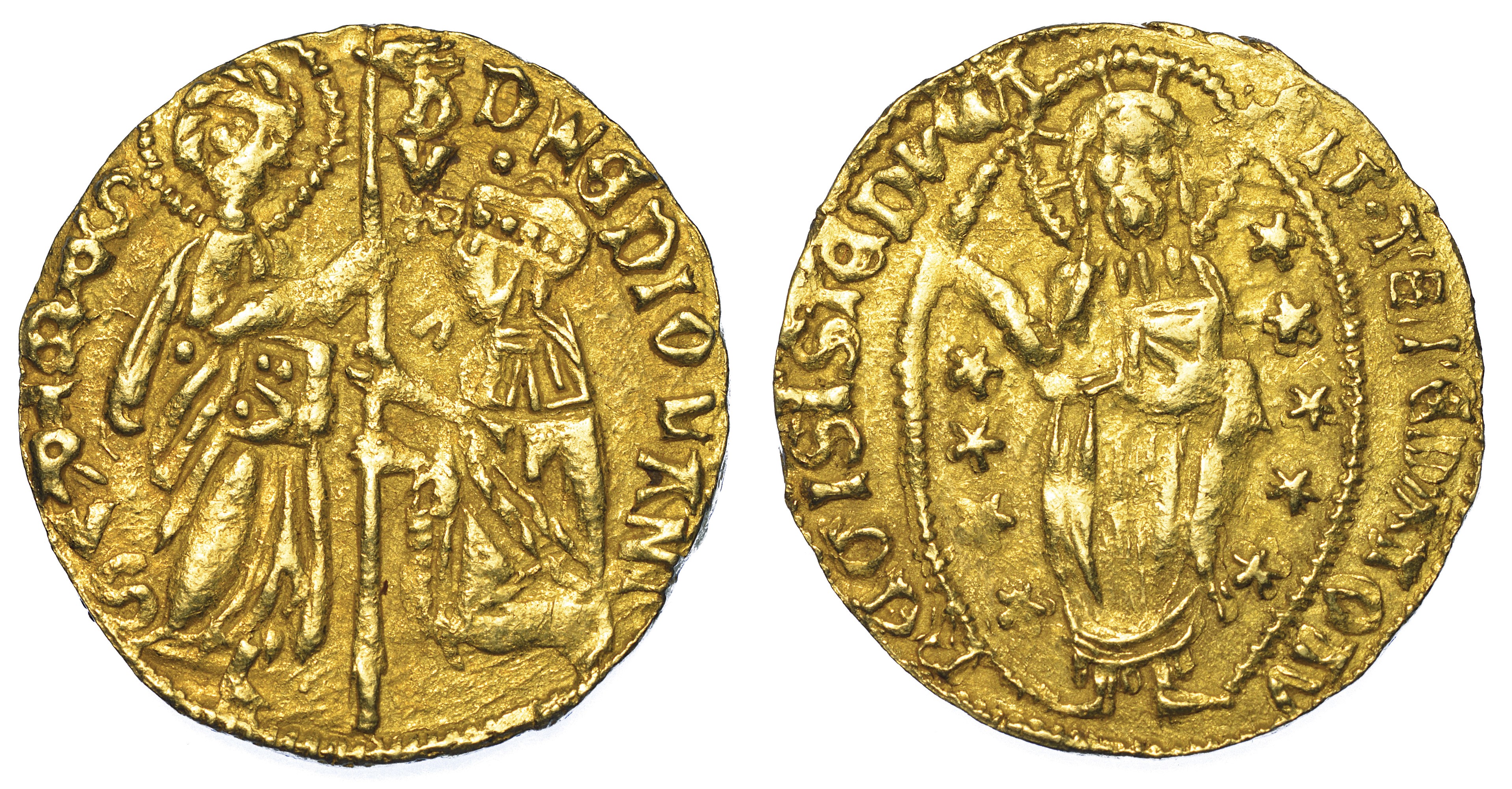 Il Santo consegna il vessillo al Duca genuflesso. R/ Il Redentore benedicente entro ellisse. Lunardi S18. Gamb. 398. g. 3,42. Diam. mm. 20,94. Oro. MB/BB