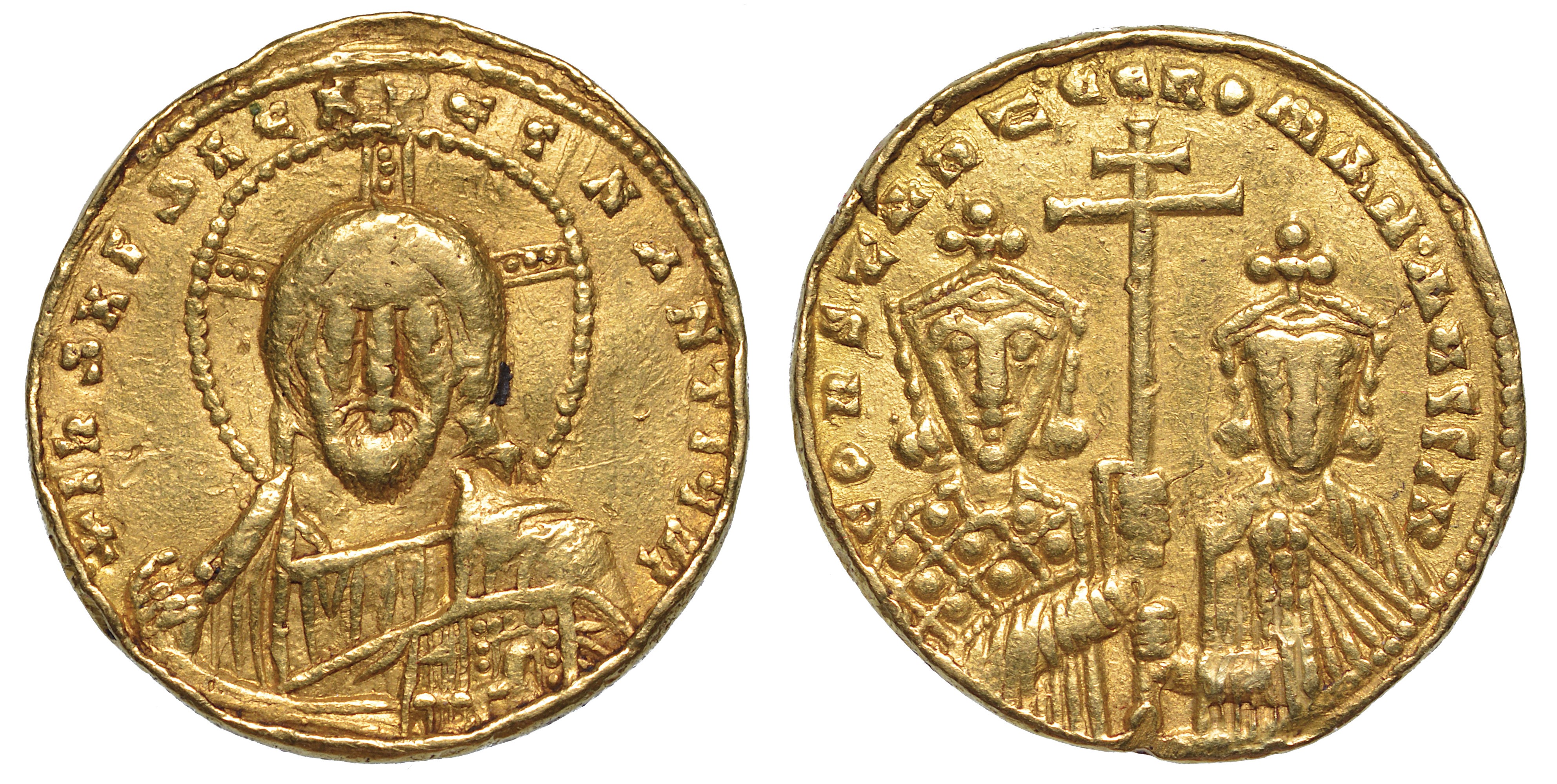 Busto nimbato e frontale del Cristo. R/ Busti frontali di Costantino VII e di Romano II con lunga croce. Sear 1751. g. 4,24. Diam. mm. 19,83. Oro. MB/BB