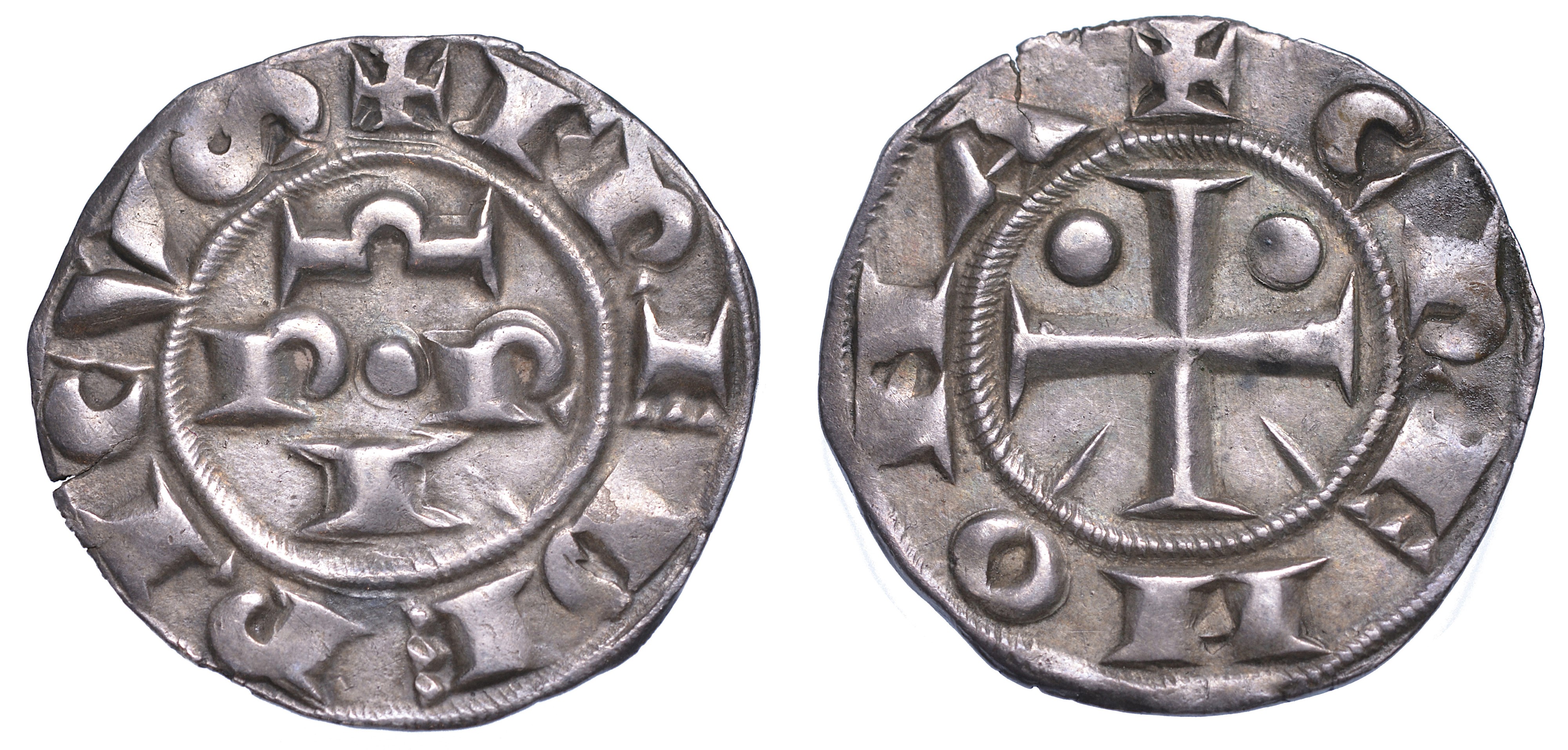 Lettere P R I su due righe e sopra Ω (omega). R/ Croce patente con bisante nel I e nel II quarto, punta nel III e IV quarto. MIR 288. CNI 10/11. g. 2,09. Diam. mm. 19,84. Arg. SPL