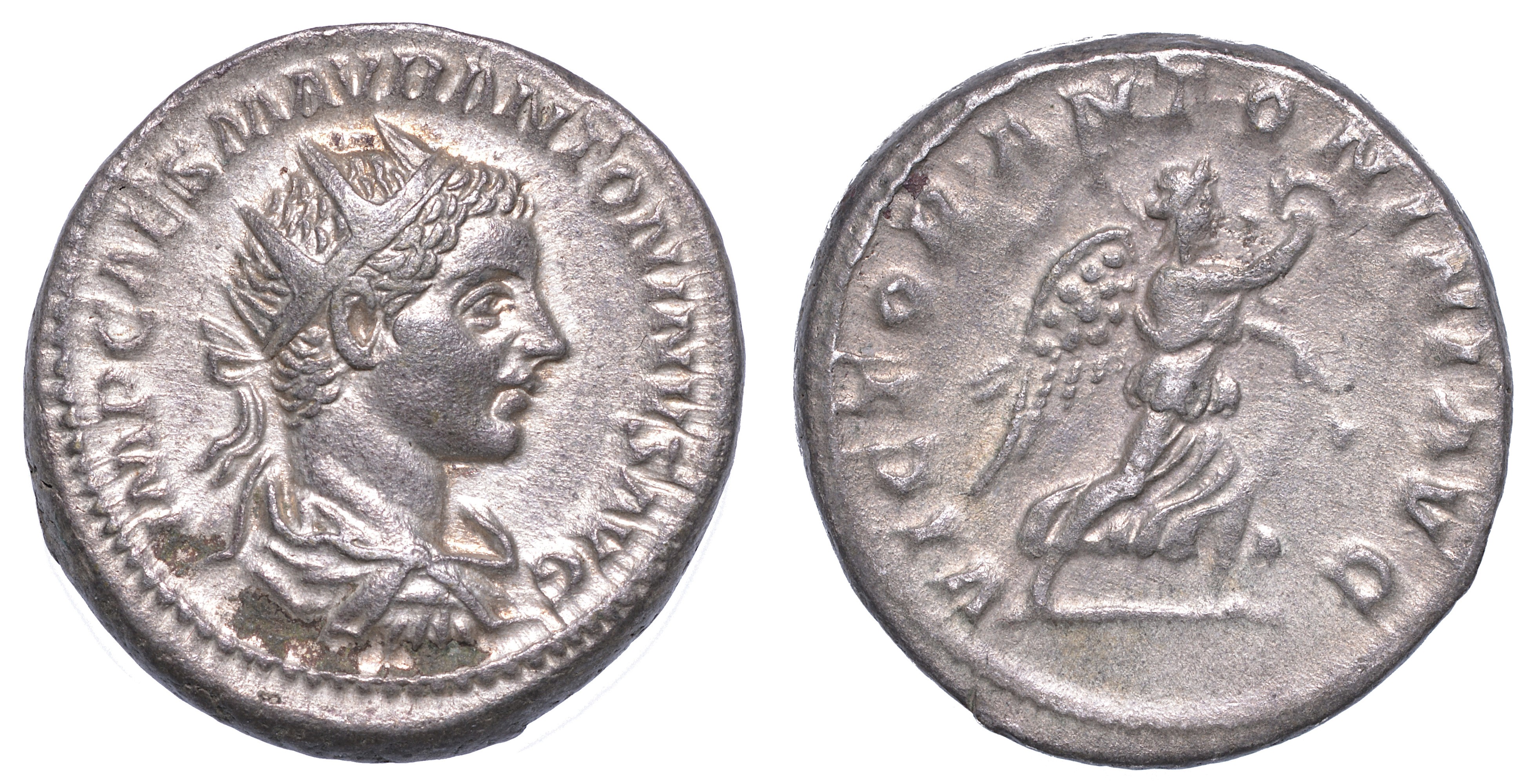 Busto drappeggiato con corona di raggi a d. R/ Vittoria corre con ghirlanda e ramo di palma a d. RIC 155. Coh. 291a. g. 6,28. Diam. mm. 22,15. Mist. q.SPL