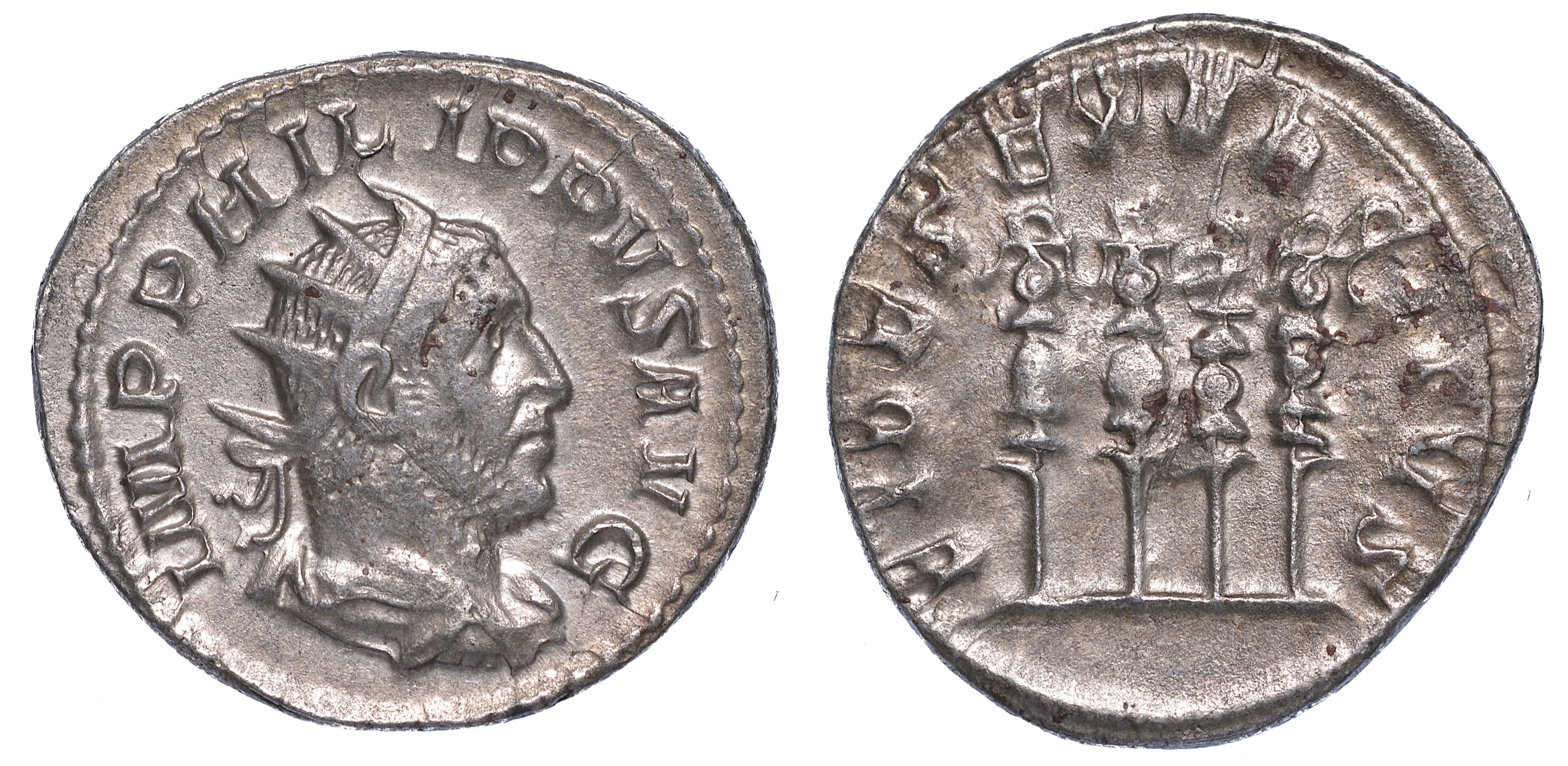 Busto radiato, drappeggiato e corazzato a d. R/ Quattro stendardi militari. Coh. 50. RIC 62. g. 4,49. Diam. mm. 20,80. Arg. q.SPL