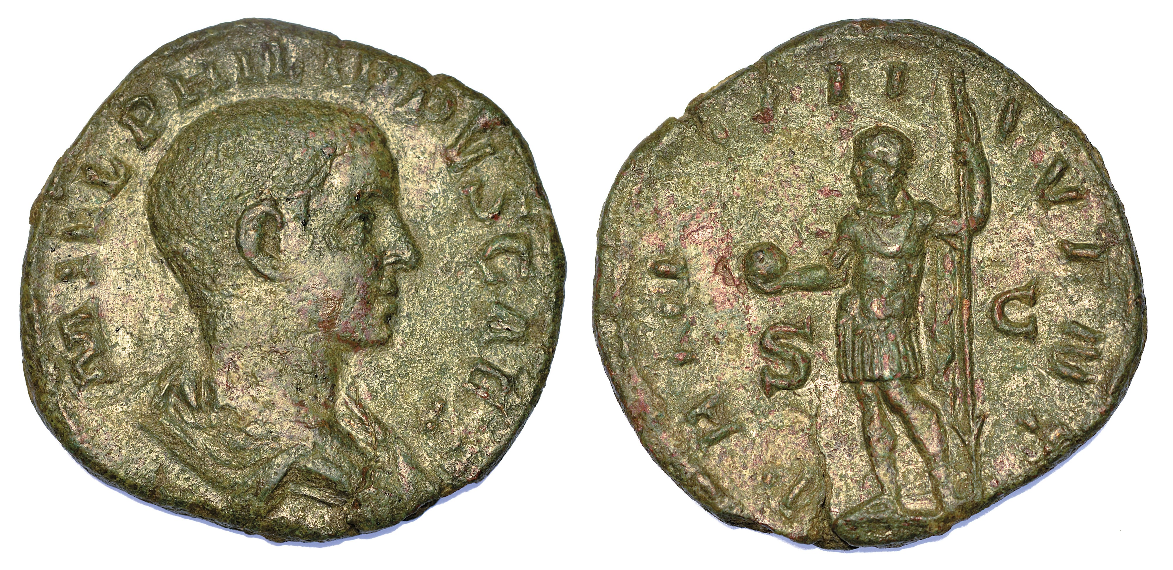 Busto paludato a d. R/ Filippo II stante tiene globo e lancia. Coh. 49. RIC 256a. g. 14,56. Diam. mm. 28,35. Bronzo. Patina verde. Migliore di BB