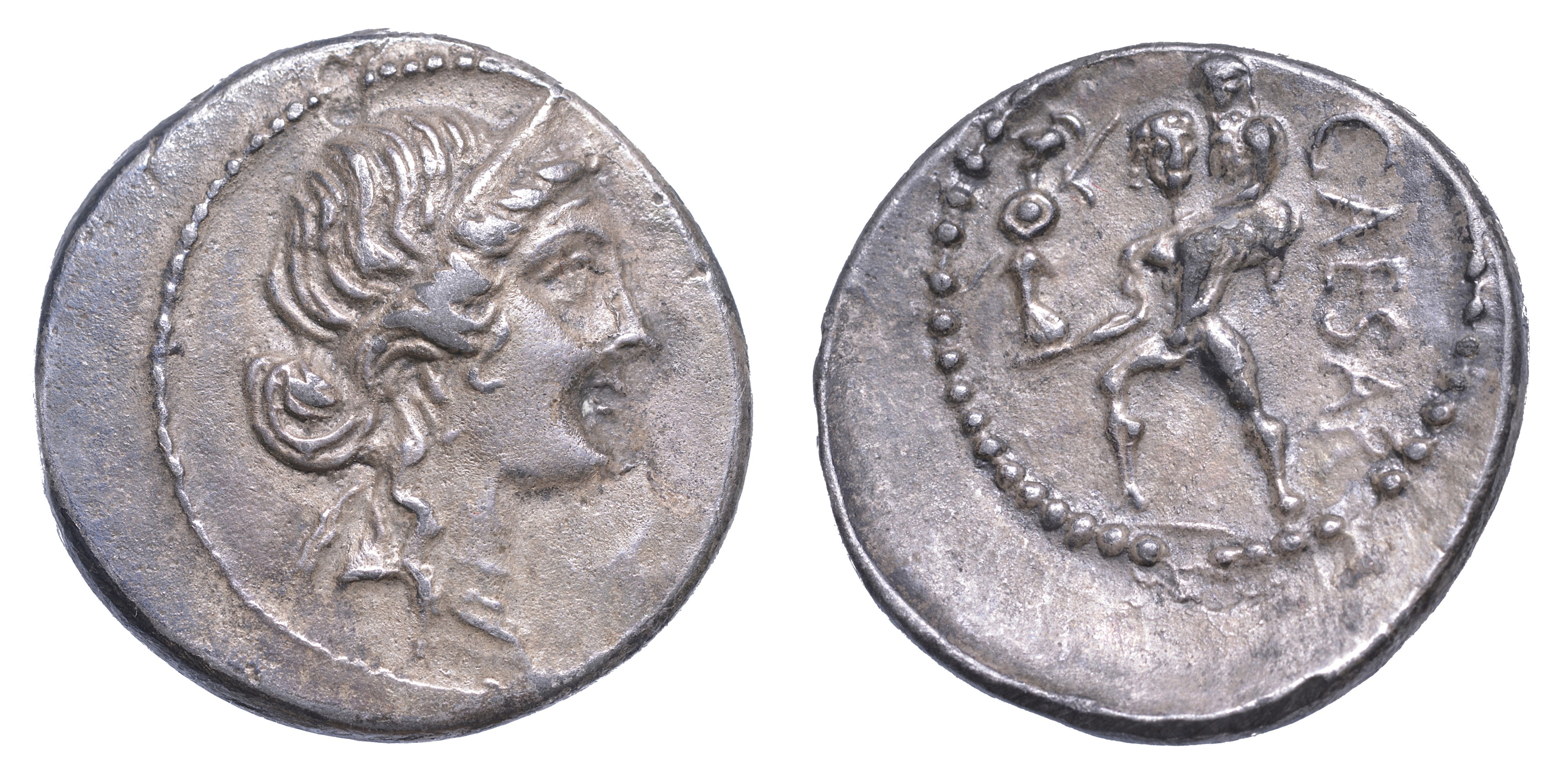 GIULIO CESARE, +44. Denario, anni 47-46. Africa.