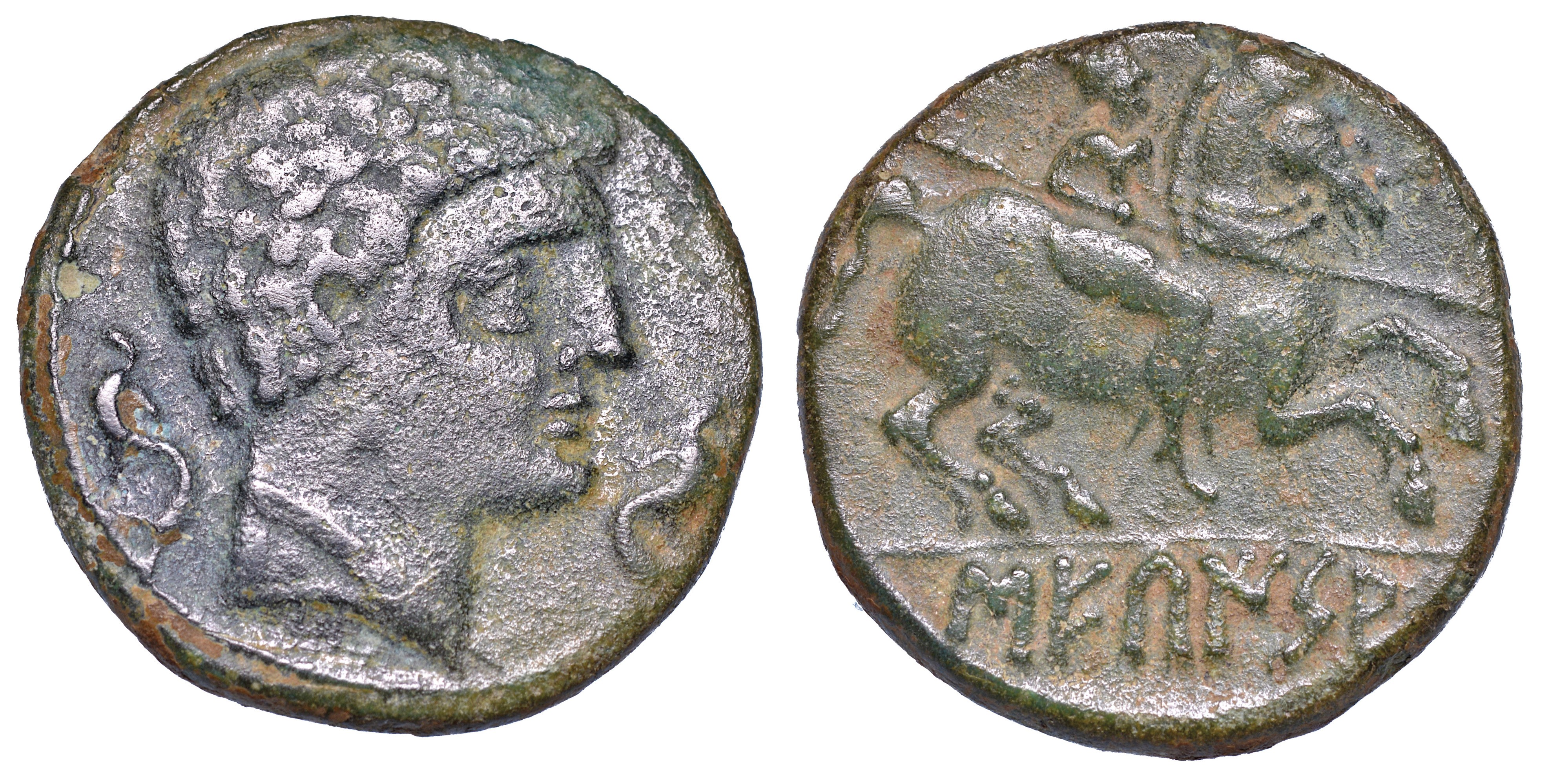 Testa maschile a d. fra due delfini. R/ Cavaliere al galoppo verso d. tiene lancia. FAB 2137. g. 7,12. Diam. mm. 22,98. Bronzo. BB