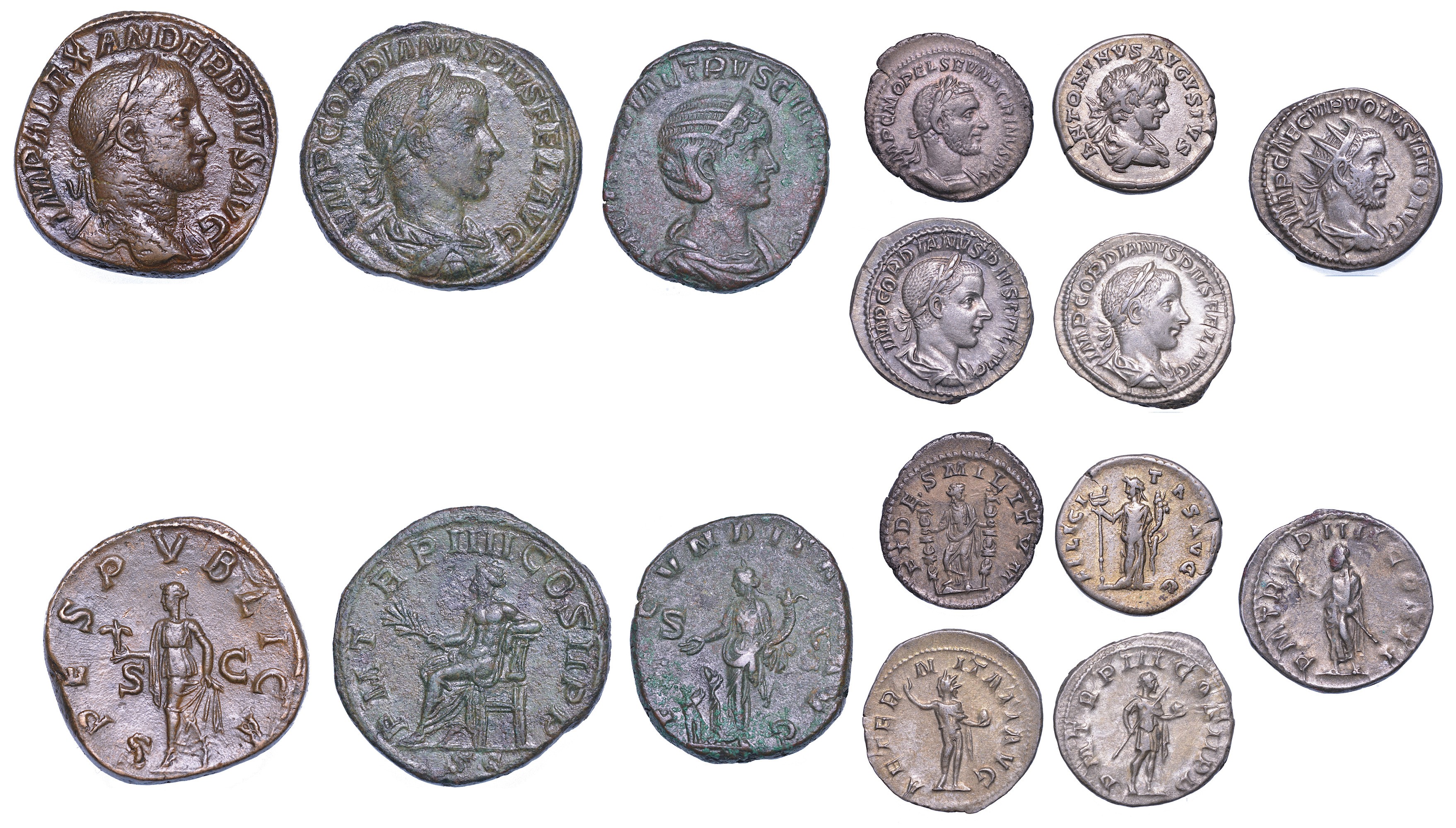 Monetazione mista composta da denari, antoniniani e sesterzi dell’Impero Romano della prima metà del III secolo dei seguenti imperatori: Caracalla, Macrino, Alessandro Severo, Gordiano III, Erennia Etruscilla, Volusiano. Argento e rame. Mediamente in alta qualità.