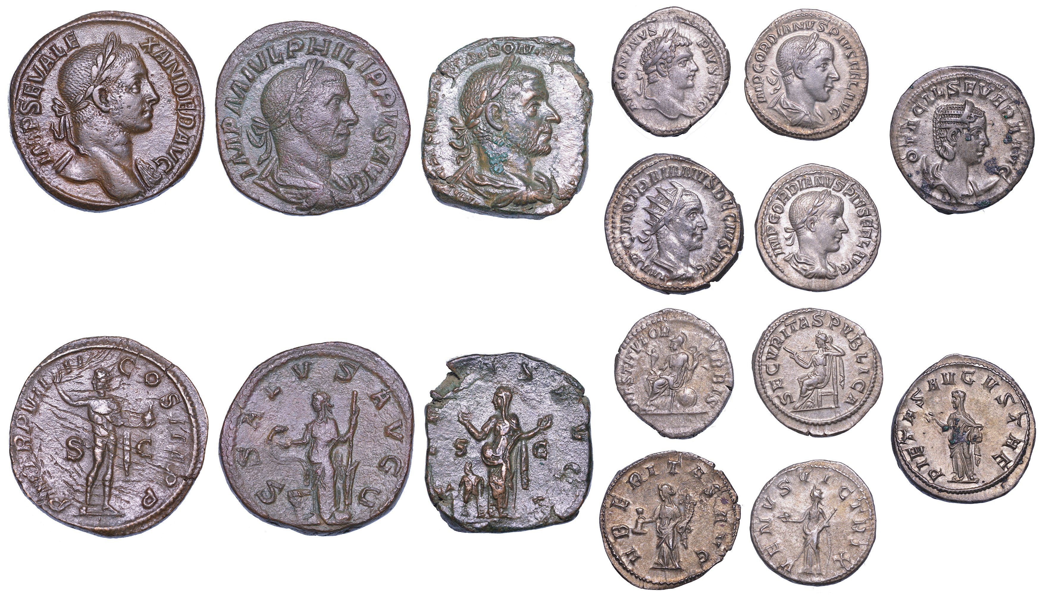 Monetazione mista composta da denari, antoniniani e sesterzi dell’Impero Romano della prima metà del III secolo dei seguenti imperatori: Alessandro Severo, Caracalla, Gordiano III, Filippo I, Otacilia Severa, Traiano Decio, Treboniano Gallo. Argento e rame. Mediamente in alta qualità.