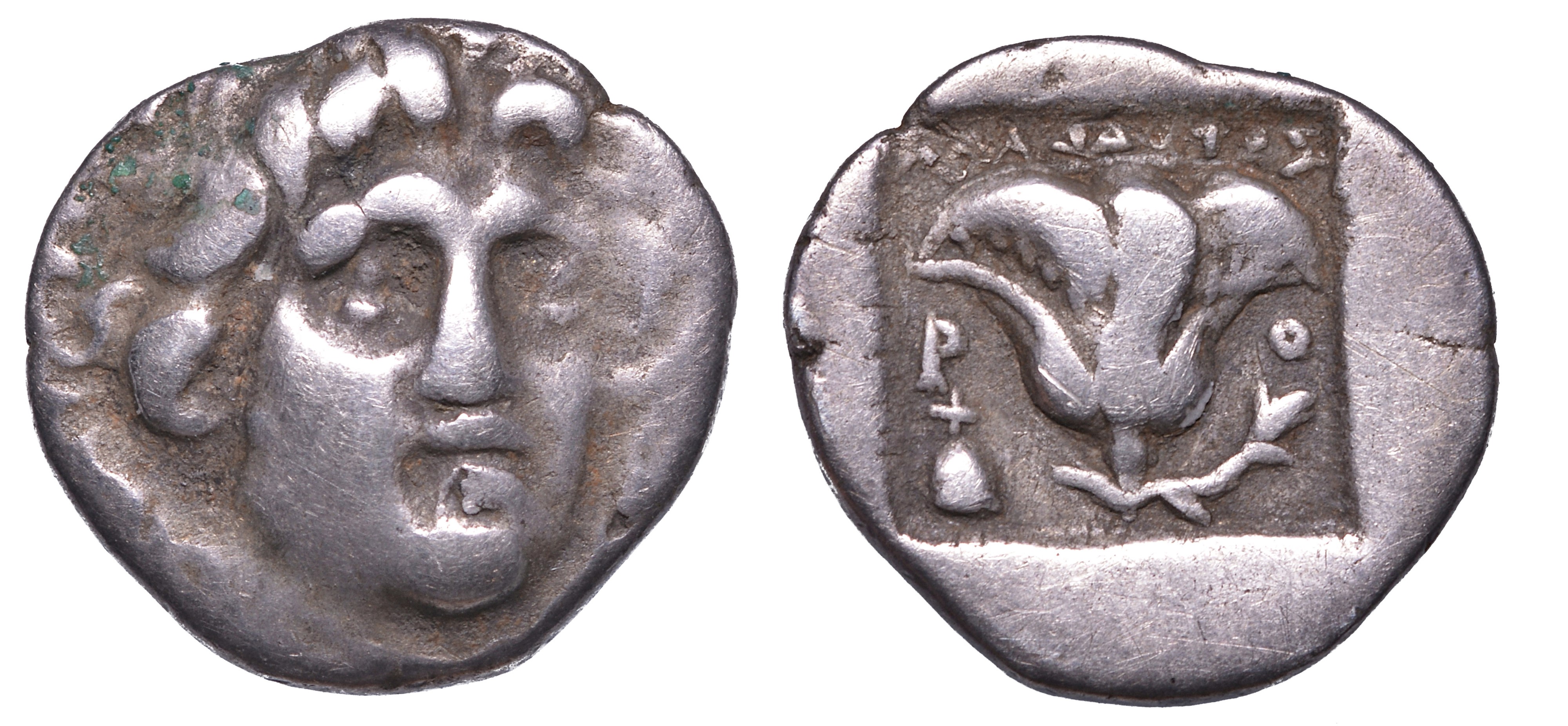 Testa di Helios di tre quarti. R/ Rosa in incuso. SNG Cop. 841/847. g. 0,98. Diam. mm. 9,98. Arg. BB