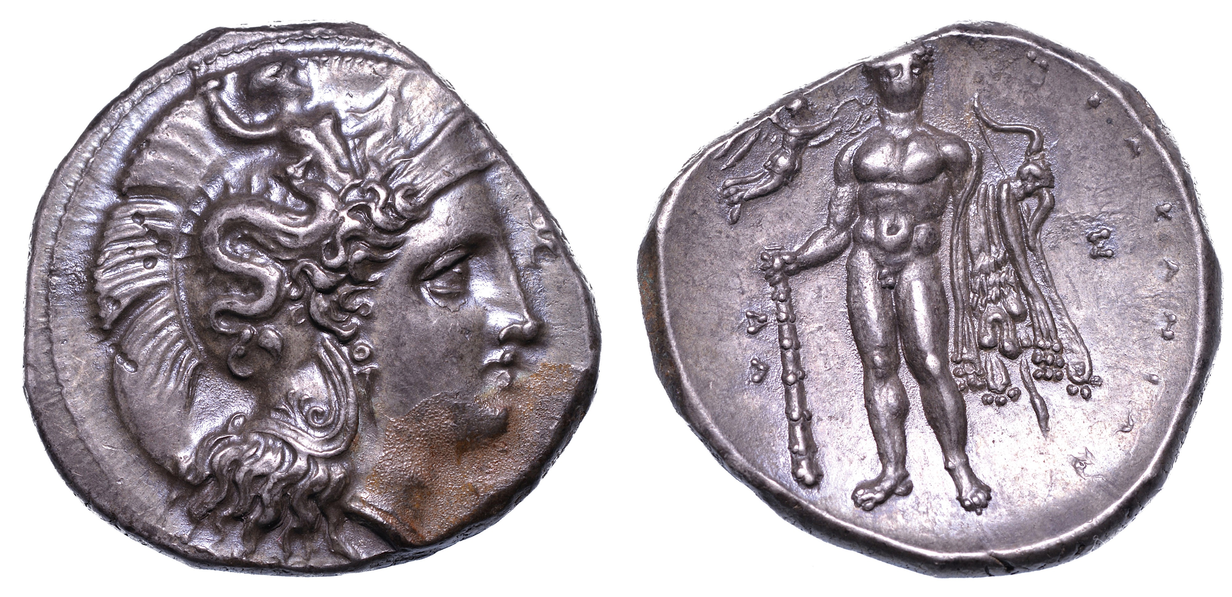 Testa di Atena a d. con elmo decorato con Scilla che lancia pietre e palmetta sulla protezione del collo. R/ Eracle, stante di fronte, tiene mazza, arco, frecce e pelle di leone; a s., Nike in volo lo incorona. Van Keuren 80. Opera 52. Historia Numorum Italia 1384. g. 7,88. Diam. mm. 21,54. Arg. Esemplare estremamente gradevole, di stile raffinato e impreziosito da brillante patina scura di monetiere. Lieve incrostazione al diritto. SPL