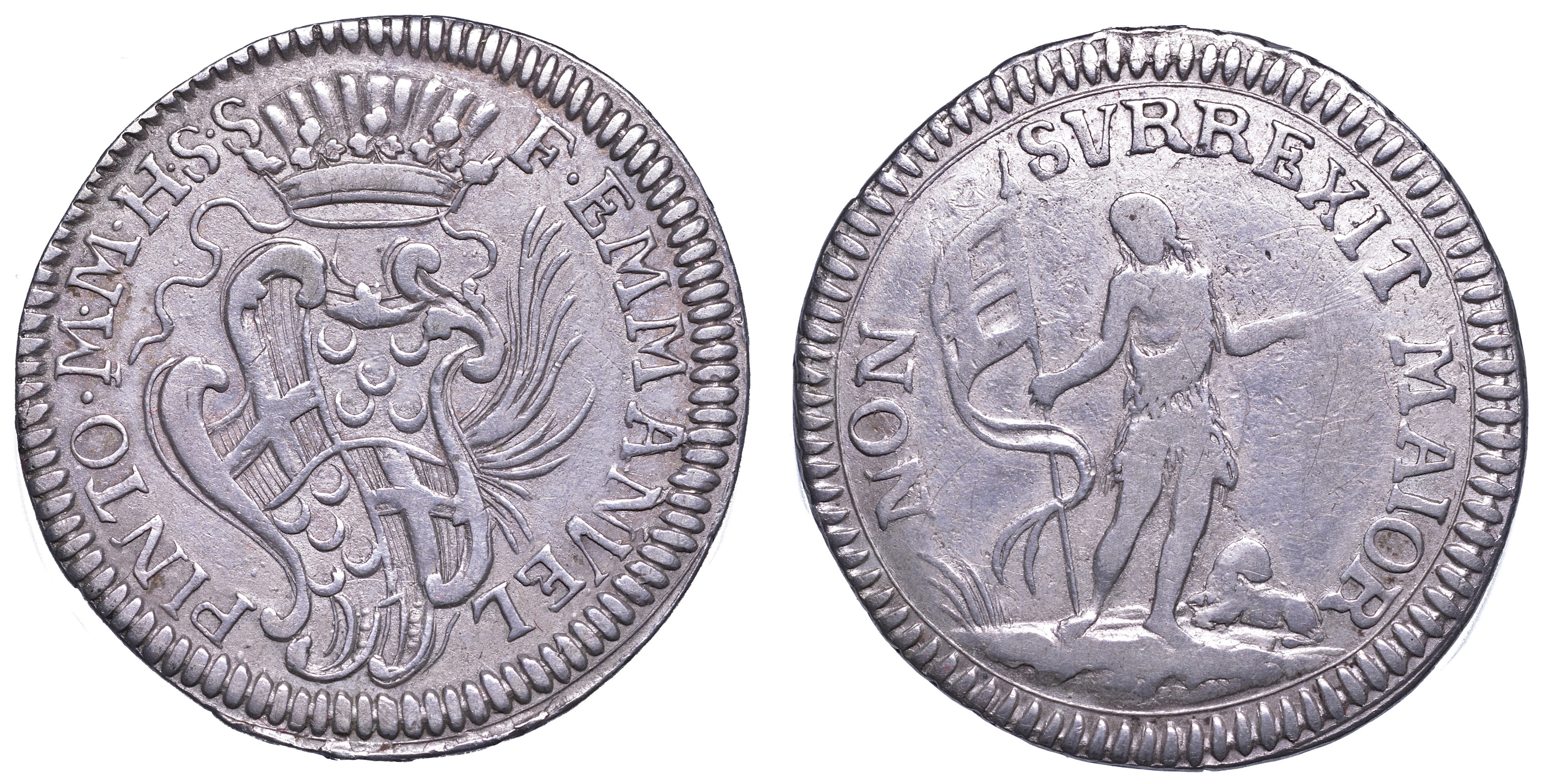 Stemma del Gran Maestro. R/ San Giovanni in piedi con lo stendardo dell'ordine. Restelli-; Schembri p. 210, n. 4. g. 6,31. Diam. mm. 28,10. Arg. BB/MB
