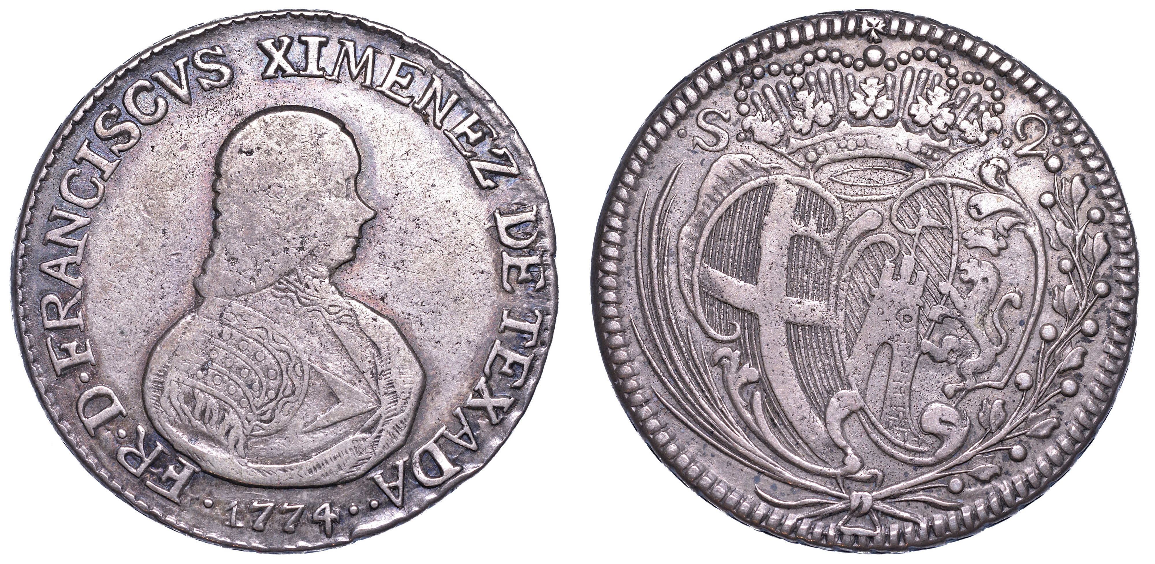 MALTA. FRANCISCO XIMENEZ DE TEXADA (69º Gran Maestro dell'Ordine dei Cavalieri Ospitalieri di Rodi e Malta ), 1773-1775. 2 Scudi 1774.