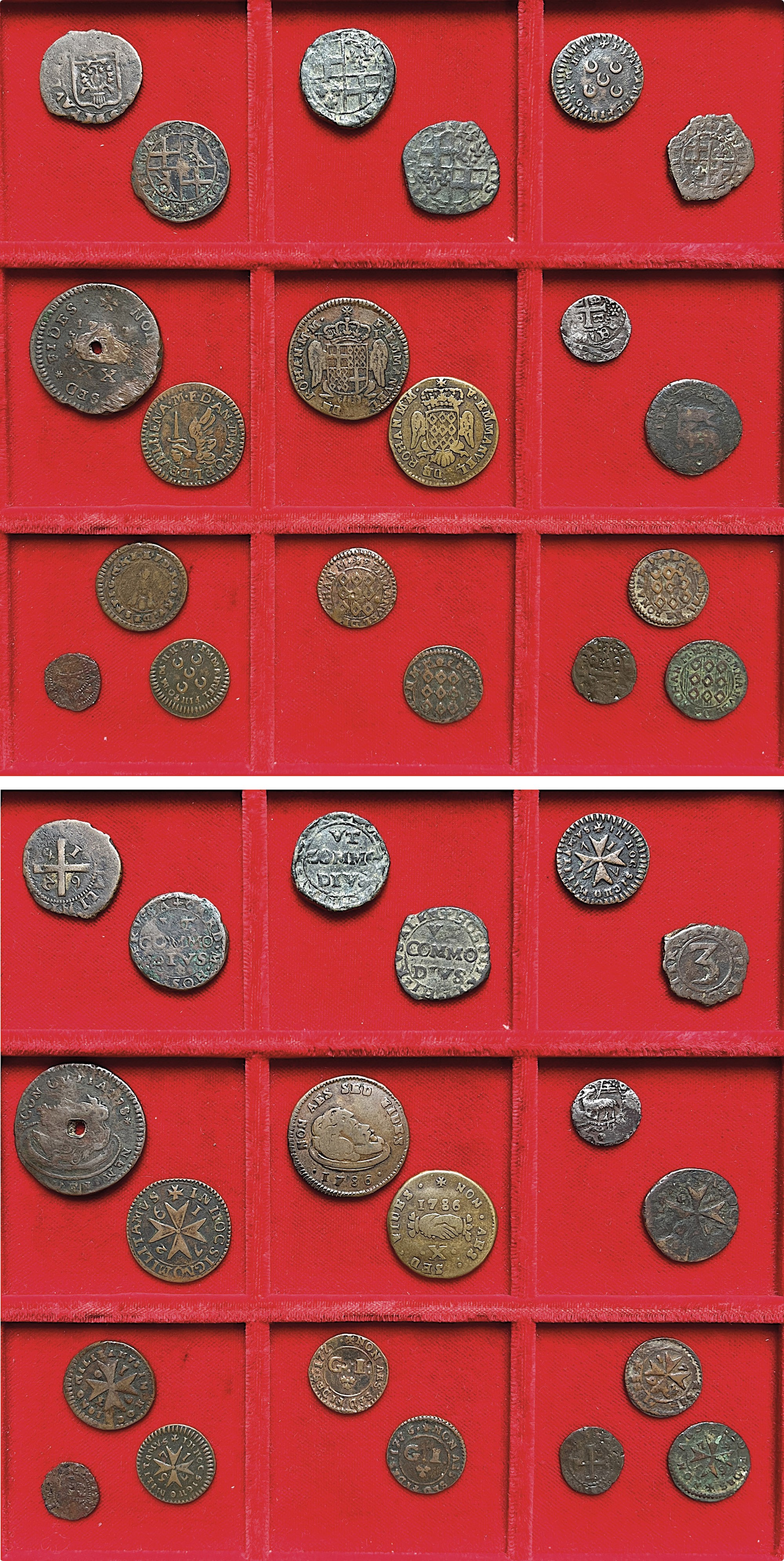 Monetazione maltese mista dal XVI al XVIII secolo. Si segnalano: HUGUES LOUBENS DE VERDALLE, 1581-1595. Grano - ALOF DE WIGNACOURT, 1601-1622. Grano - ANTONIO MANUEL DE VILHENA, 1722-1736. Grano 1726 - RAMON DE DESPUIG, 1736-1741. Grano 1739 - EMMANUEL DE ROHAN, 1775-1797. Tarì 1786 - Carlino 1786. Esemplari in rame. Conservazioni da B a MB/BB.