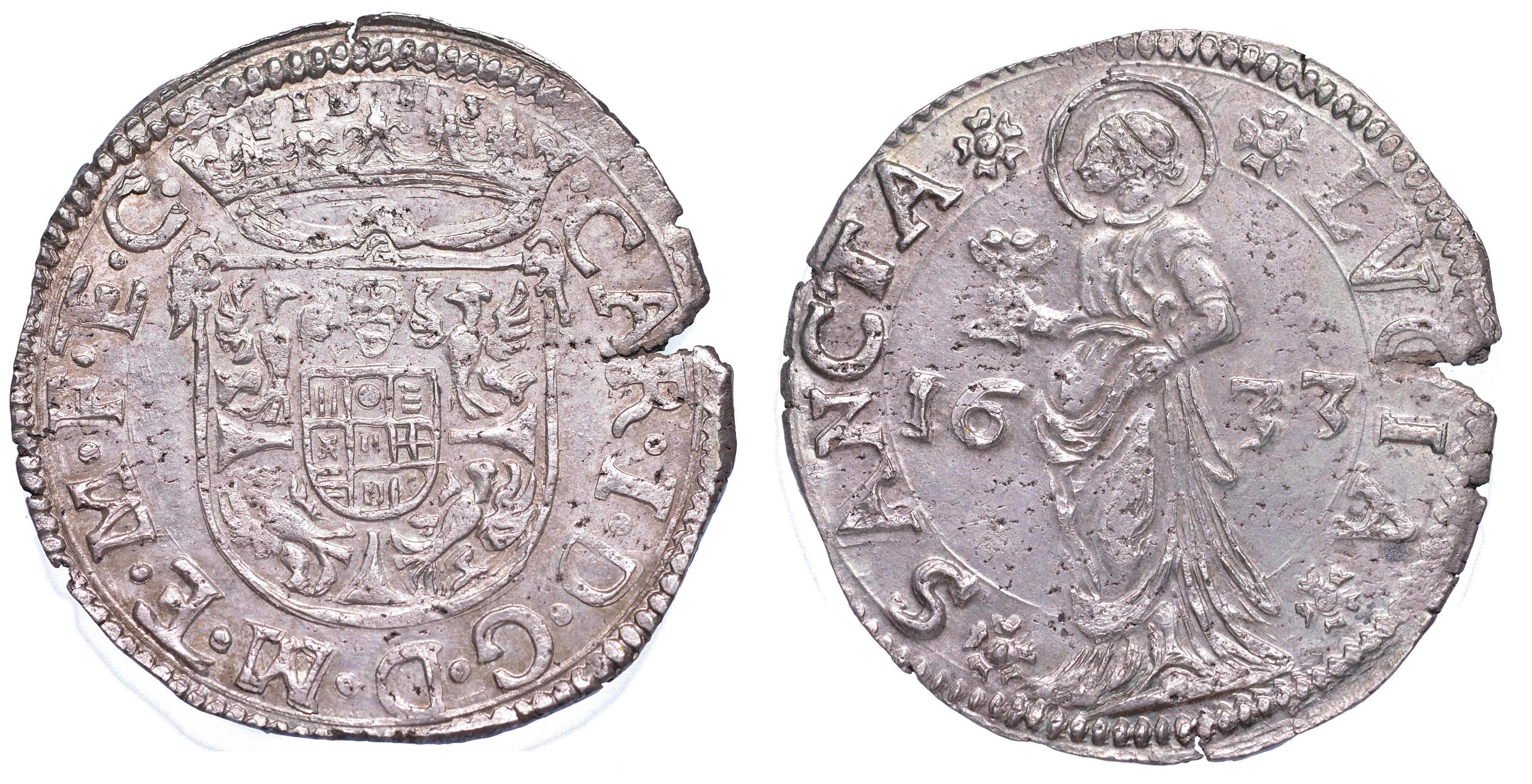 Stemma coronato. R/ Santa Lucia con coppa; ai lati, 16 33. CNI 19/21. MIR 650. g. 4,33. Diam. mm. 28,66. Arg. Irregolarità di conio. SPL